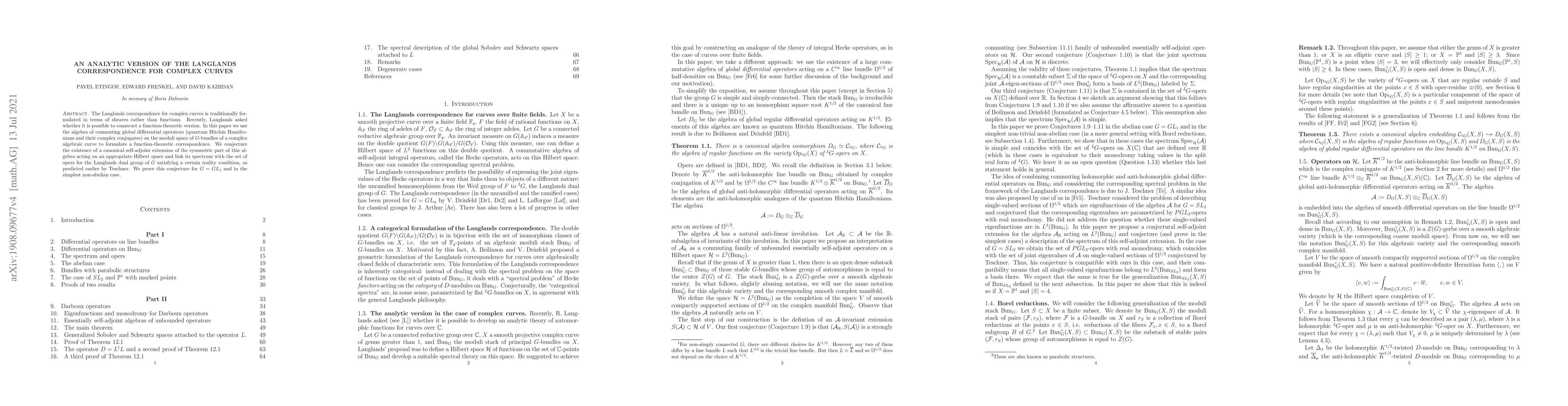 This paper constructs a function-theoretic version of the Langlands correspondence for complex curves using commuting global differential operators on moduli spaces. The authors prove their conjecture linking the spectrum of a self-adjoint extension of this algebra to opers for the Langlands dual group, specifically for G=GL(1) and a simple non-abelian case.