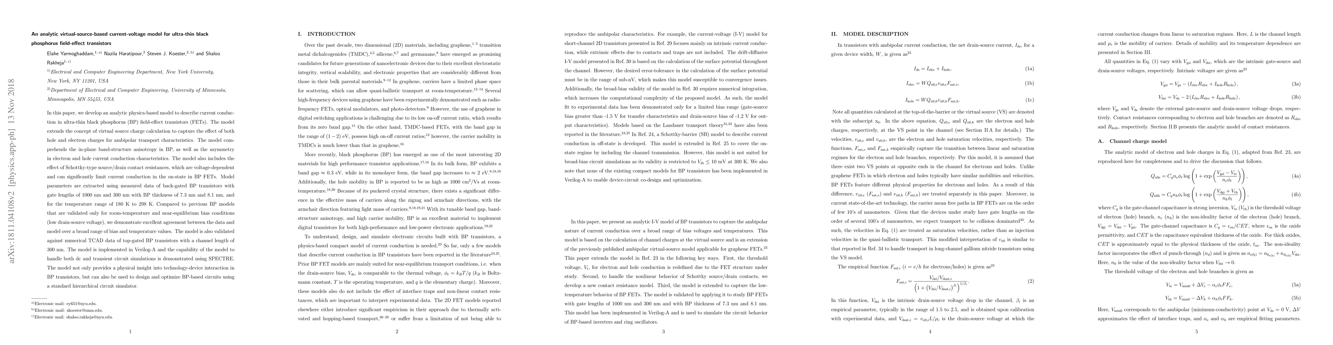 This paper presents an analytic model for ultra-thin black phosphorus FETs that accurately captures ambipolar transport and in-plane band-structure anisotropy. The model, validated over a wide range of biases and temperatures, also considers voltage-dependent contact resistances and is implemented in Verilog-A for circuit simulations.