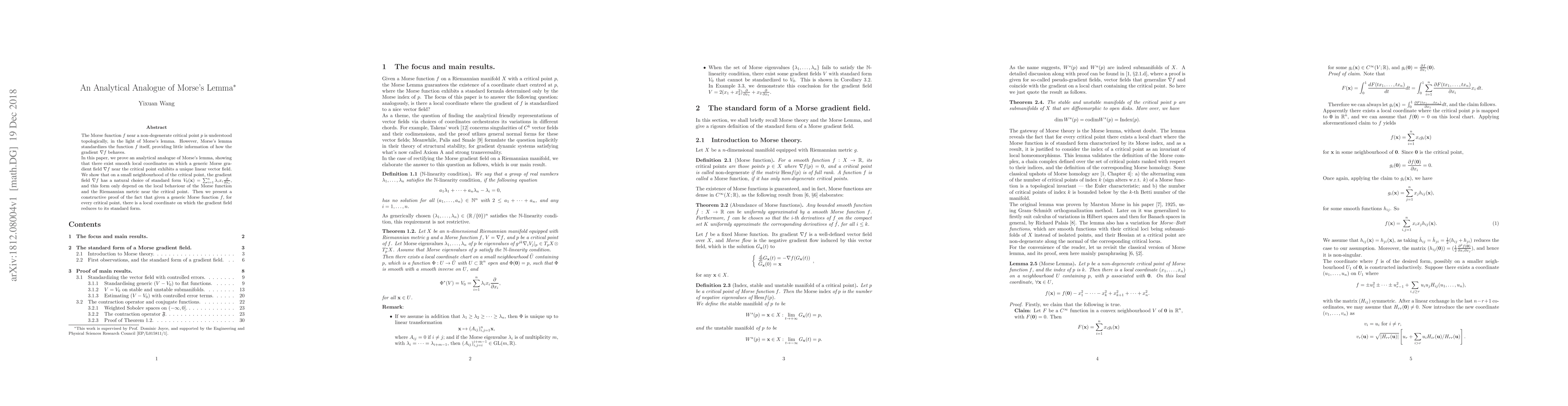 The Morse function $f$ near a non-degenerate critical point $p$ is understood topologically, in the light of Morse's lemma. However, Morse's lemma standardizes the function $f$ itself, providing little information of how the gradient $\nabla f$ behaves. In this paper, we prove an analytical analogue of Morse's lemma, showing that there exist smooth local coordinates on which a generic Morse gradient field $\nabla f$ near the critical point exhibits a unique linear vector field. We show that on a small neighbourhood of the critical point, the gradient field $\nabla f$ has a natural choice of standard form $V_0(\mathbb{x})=\sum_{i=1}^n \lambda_ix_i\frac{\partial}{\partial x_i}$, and this form only depend on the local behaviour of the Morse function and the Riemannian metric near the critical point. Then we present a constructive proof of the fact that given a generic Morse function $f$, for every critical point, there is a local coordinate on which the gradient field reduces to its standard form.