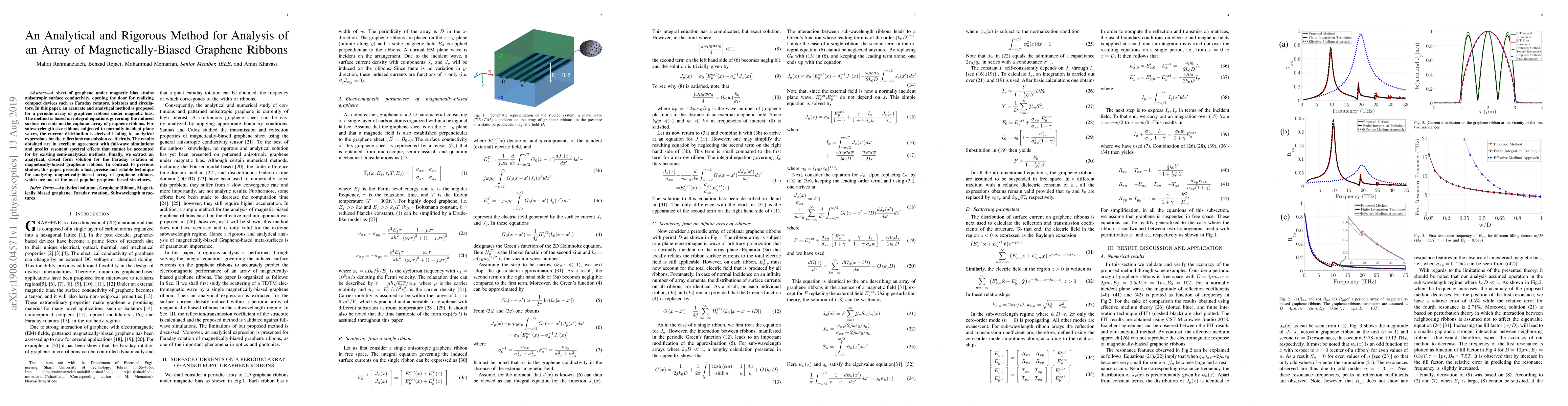 A sheet of graphene under magnetic bias attains anisotropic surface conductivity, opening the door for realizing compact devices such as Faraday rotators, isolators and circulators. In this paper, an accurate and analytical method is proposed for a periodic array of graphene ribbons under magnetic bias. The method is based on integral equations governing the induced surface currents on the coplanar array of graphene ribbons. For subwavelength size ribbons subjected to normally incident plane waves, the current distribution is derived leading to analytical expressions for the reflection/transmission coefficients. The results obtained are in excellent agreement with full-wave simulations and predict resonant spectral effects that cannot be accounted for by existing semi-analytical methods. Finally, we extract an analytical, closed form solution for the Faraday rotation of magnetically-biased graphene ribbons. In contrast to previous studies, this paper presents a fast, precise and reliable technique for analyzing magnetically-biased array of graphene ribbons, which are one of the most popular graphene-based structures.