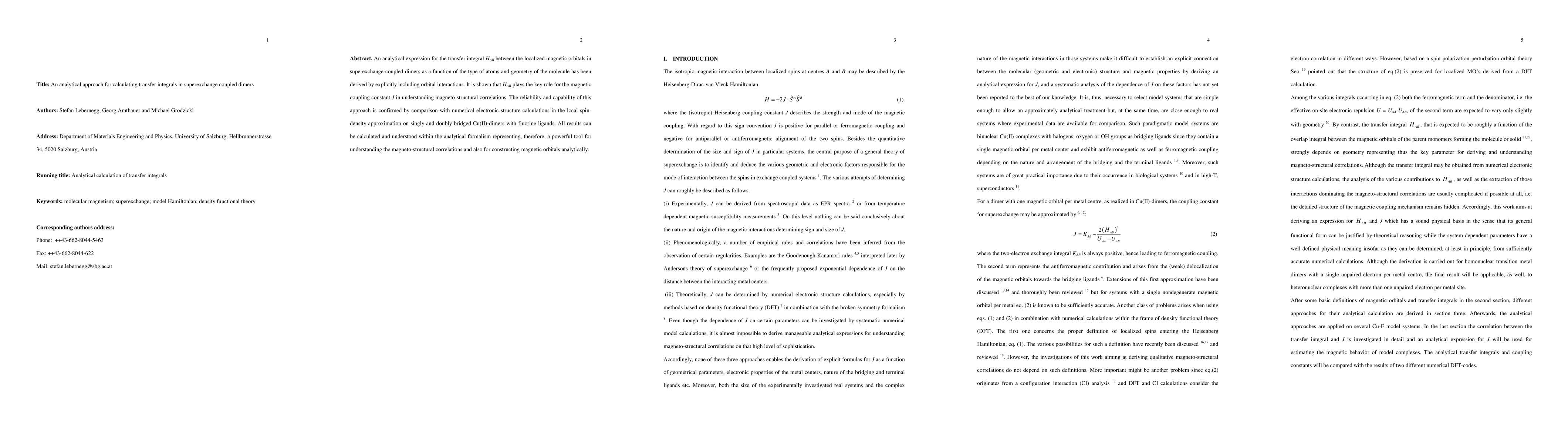 This paper derives an analytical expression for the transfer integral HAB in superexchange-coupled dimers, emphasizing its role in determining magnetic coupling constants J. The approach is validated through comparison with numerical calculations on Cu(II)-dimers, demonstrating its utility in understanding magneto-structural correlations.