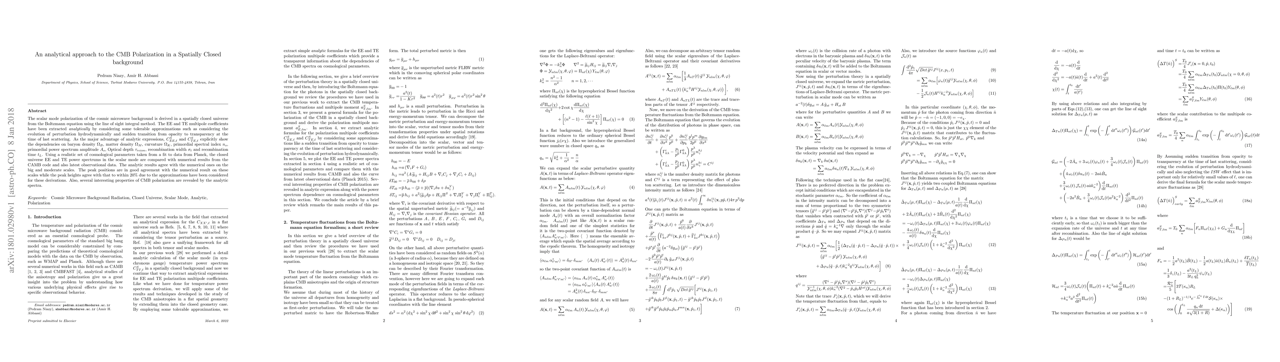 This paper derives the scalar mode polarization of the cosmic microwave background (CMB) in a spatially closed universe using analytical methods and compares the results with numerical simulations and observational data. The analytical approach reveals dependencies on various cosmological parameters and agrees well with numerical results on large and moderate scales.