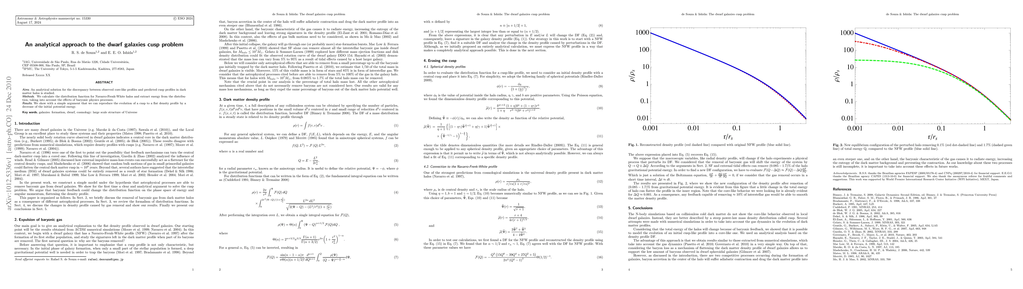 An analytical solution for the discrepancy between observed core-like profiles and predicted cusp profiles in dark matter halos is studied. We calculate the distribution function for Navarro-Frenk-White halos and extract energy from the distribution, taking into account the effects of baryonic physics processes. We show with a simple argument that we can reproduce the evolution of a cusp to a flat density profile by a decrease of the initial potential energy.