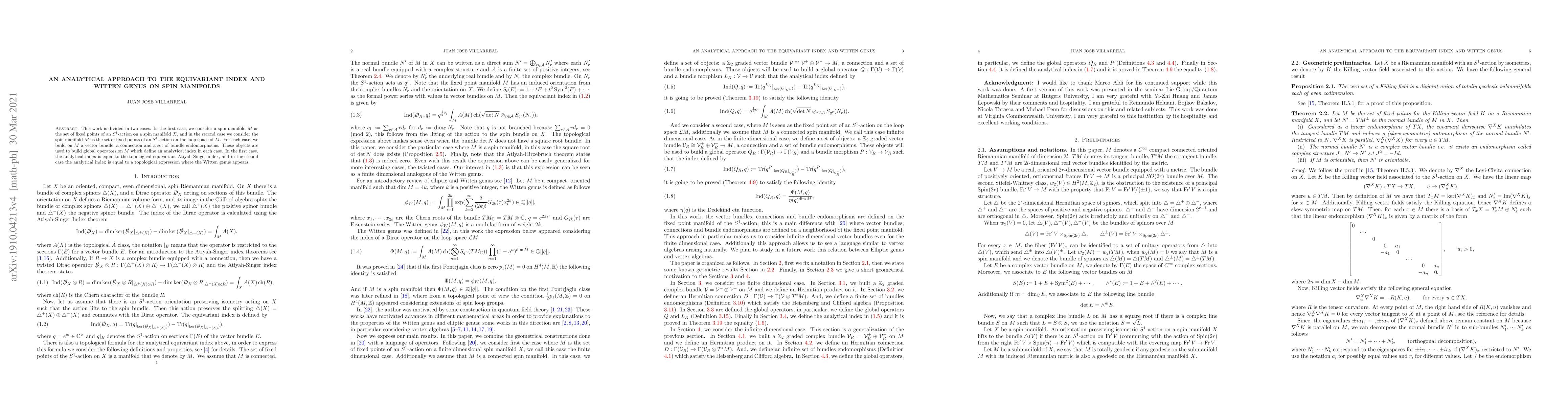 This work is divide in two cases. In the first case, we consider a spin manifold $M$ as the set of fixed points of an $S^{1}$-action on a spin manifold $X$, and in the second case we consider the spin manifold $M$ as the set of fixed points of an $S^{1}$-action on the loop space of $M$. For each case, we build on $M$ a vector bundle, a connection and a set of bundle endomorphisms. These objects are used to build global operators on $M$ which define an analytical index in each case. In the first case, the analytical index is equal to the topological equivariant Atiyah Singer index, and in the second case the analytical index is equal to a topological expression where the Witten genus appears.