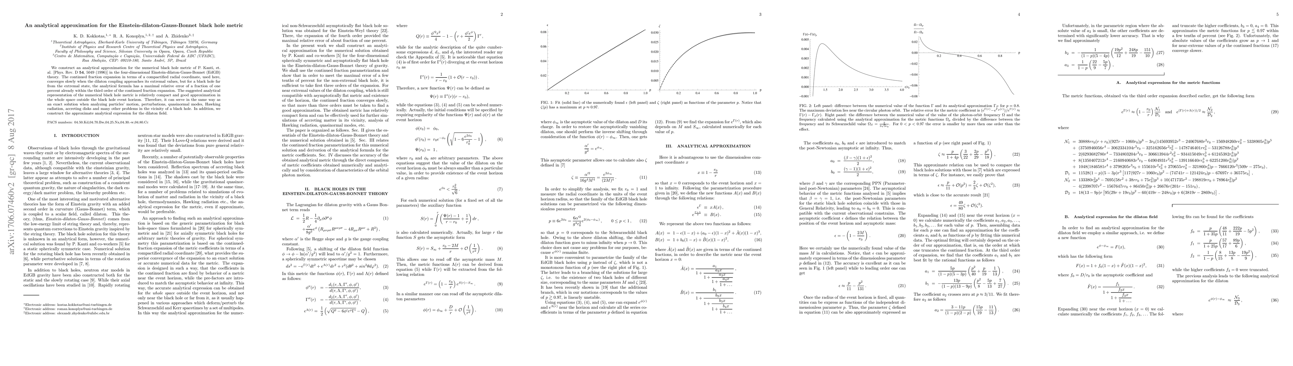 This paper provides an analytical approximation for the numerical black hole metric in the four-dimensional Einstein-dilaton-Gauss-Bonnet theory, showing a maximal relative error of a fraction of one percent. The approximation is useful for analyzing various phenomena near black holes.