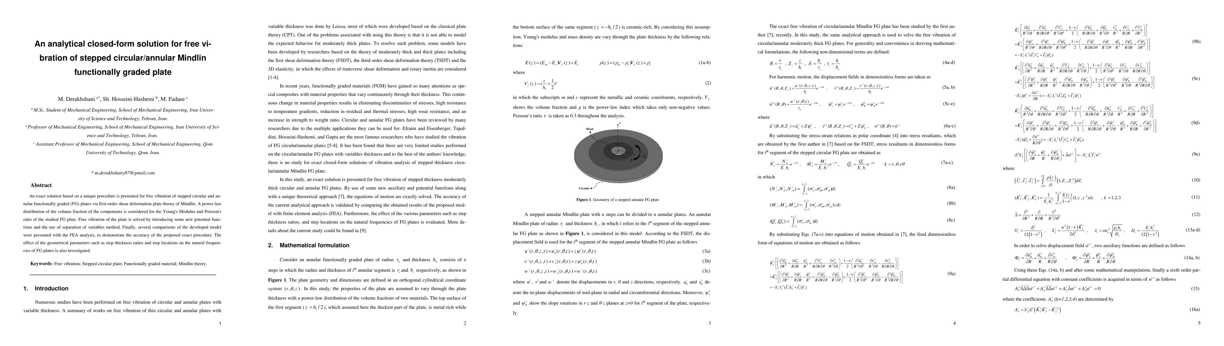 This paper presents an analytical closed-form solution for the free vibration of stepped circular/annular Mindlin functionally graded plates using first-order shear deformation theory. The study employs a power-law distribution for material properties and validates the model's accuracy through comparisons with finite element analysis and an investigation of geometrical parameters' effects on natural frequencies.