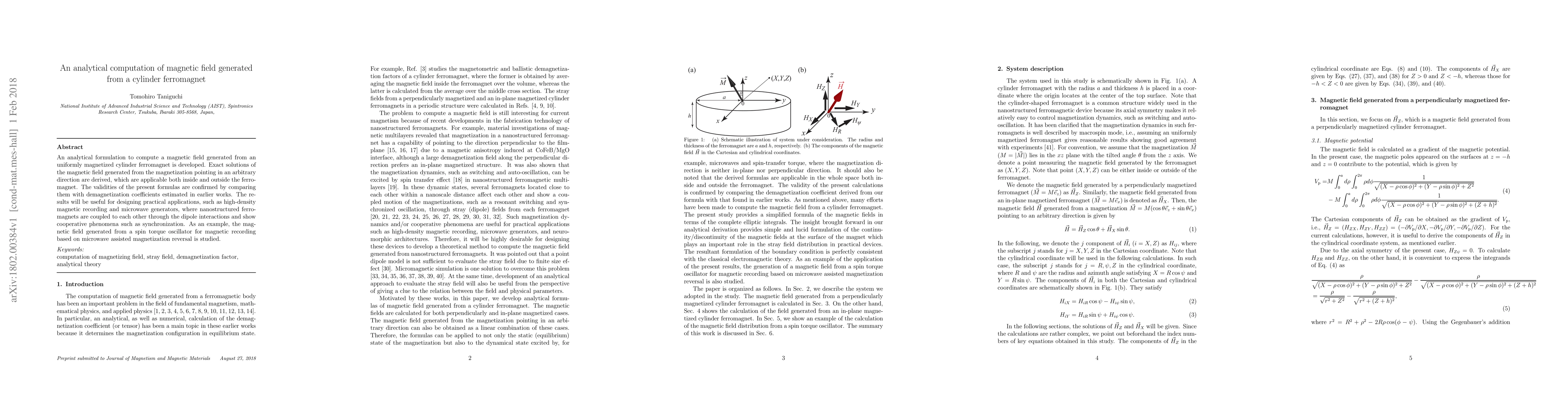 An analytical formulation to compute a magnetic field generated from an uniformly magnetized cylinder ferromagnet is developed. Exact solutions of the magnetic field generated from the magnetization pointing in an arbitrary direction are derived, which are applicable both inside and outside the ferromagnet. The validities of the present formulas are confirmed by comparing them with demagnetization coefficients estimated in earlier works. The results will be useful for designing practical applications, such as high-density magnetic recording and microwave generators, where nanostructured ferromagnets are coupled to each other through the dipole interactions and show cooperative phenomena such as synchronization. As an example, the magnetic field generated from a spin torque oscillator for magnetic recording based on microwave assisted magnetization reversal is studied.