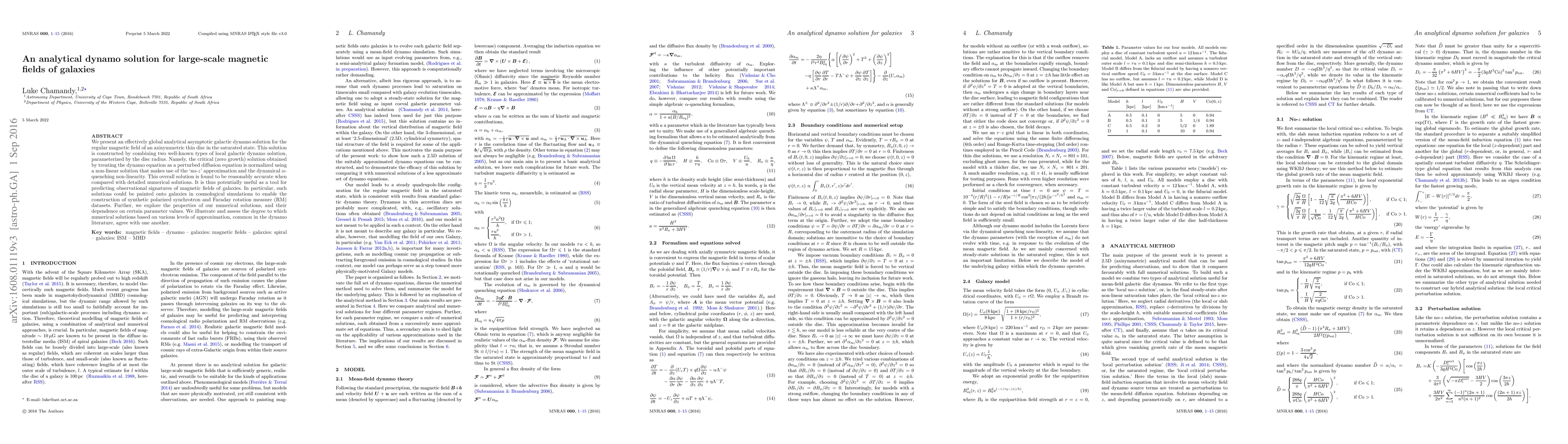 We present an effectively global analytical asymptotic galactic dynamo solution for the regular magnetic field of an axisymmetric thin disc in the saturated state. This solution is constructed by combining two well-known types of local galactic dynamo solution, parameterized by the disc radius. Namely, the critical (zero growth) solution obtained by treating the dynamo equation as a perturbed diffusion equation is normalized using a non-linear solution that makes use of the `no-$z$' approximation and the dynamical $\alpha$-quenching non-linearity. This overall solution is found to be reasonably accurate when compared with detailed numerical solutions. It is thus potentially useful as a tool for predicting observational signatures of magnetic fields of galaxies. In particular, such solutions could be painted onto galaxies in cosmological simulations to enable the construction of synthetic polarized synchrotron and Faraday rotation measure (RM) datasets. Further, we explore the properties of our numerical solutions, and their dependence on certain parameter values. We illustrate and assess the degree to which numerical solutions based on various levels of approximation, common in the dynamo literature, agree with one another.