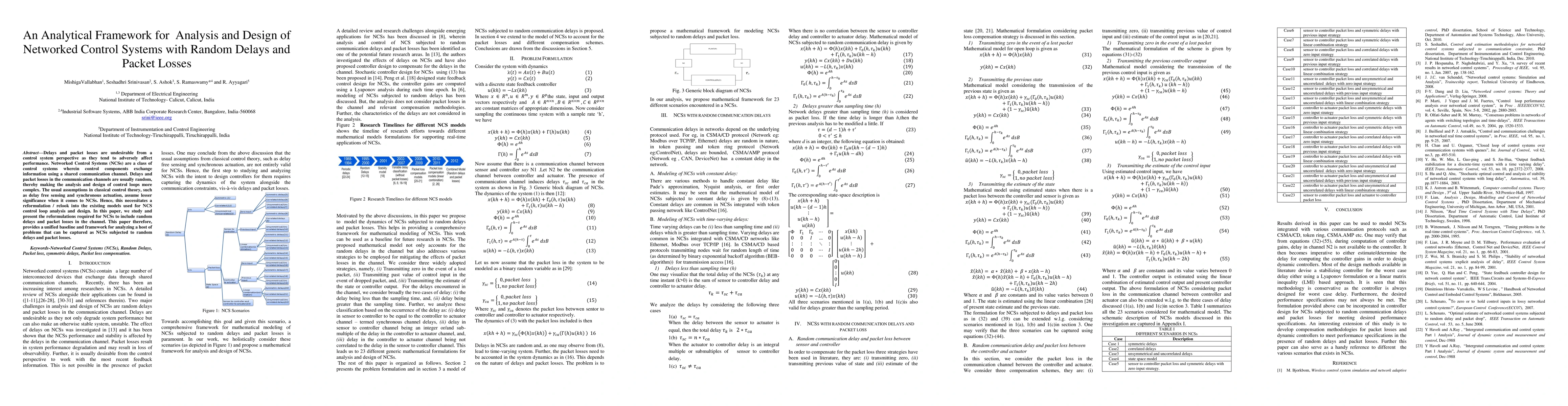 Delays and data losses are undesirable from a control system perspective as they tend to adversely affect performance Networked Control Systems (NCSs) are a class of control systems wherein control components exchange information using a shared communication channel. Delays and packet losses in the communication channels are usually random, thereby making the analysis and design of control loops more complex. The usual assumptions in classical control theory, such as delay free sensing and synchronous actuation, assume lesser significance when it comes to NCSs. Hence, this necessitates a reformulation/relook into the existing models used for NCS control loop analysis and design. In this paper, we study and present the reformulations required for NCSs to include random delays and packet loss in the channel. This paper thereby gives a complete overview of what has been accomplished thus far in NCS research and puts forth a unified framework for analyzing a host of problems that can be captured as NCSs subjected to random delays and packet losses.