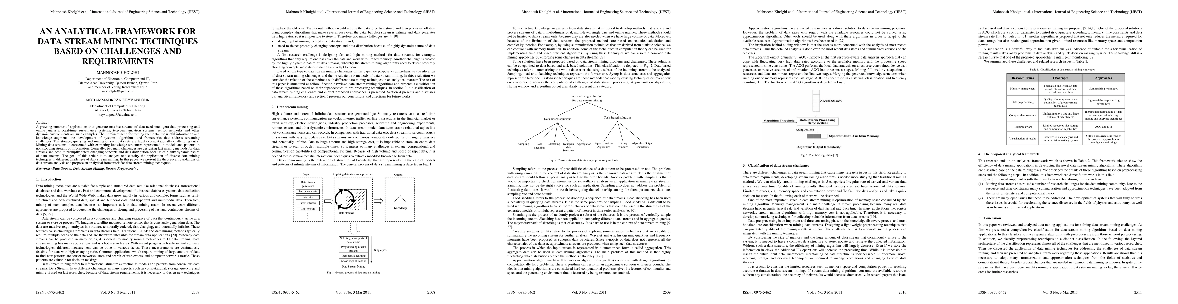 A growing number of applications that generate massive streams of data need intelligent data processing and online analysis. Real-time surveillance systems, telecommunication systems, sensor networks and other dynamic environments are such examples. The imminent need for turning such data into useful information and knowledge augments the development of systems, algorithms and frameworks that address streaming challenges. The storage, querying and mining of such data sets are highly computationally challenging tasks. Mining data streams is concerned with extracting knowledge structures represented in models and patterns in non stopping streams of information. Generally, two main challenges are designing fast mining methods for data streams and need to promptly detect changing concepts and data distribution because of highly dynamic nature of data streams. The goal of this article is to analyze and classify the application of diverse data mining techniques in different challenges of data stream mining. In this paper, we present the theoretical foundations of data stream analysis and propose an analytical framework for data stream mining techniques.
