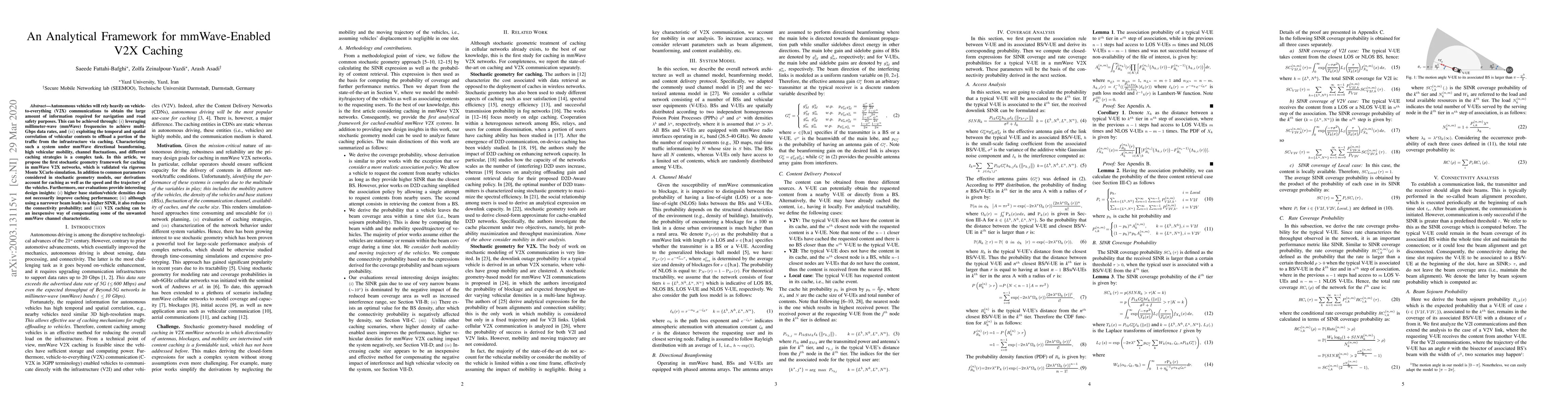 This paper proposes a stochastic geometry framework for analyzing mmWave-enabled V2X caching, validated by Monte Carlo simulations. It reveals that higher base station/vehicle densities do not always enhance caching performance, and narrower beams improve SINR but reduce connectivity probability.