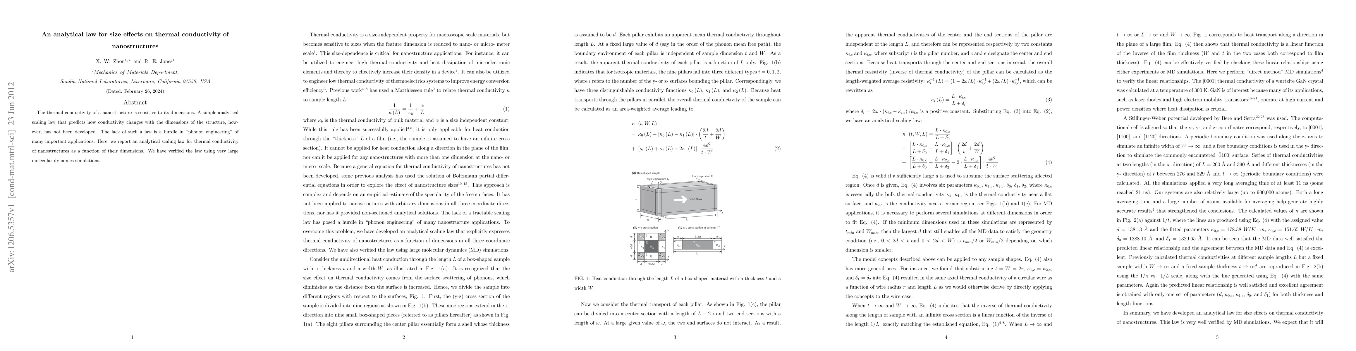 This paper presents an analytical scaling law predicting how thermal conductivity varies with the dimensions of nanostructures, addressing a critical gap in "phonon engineering." The proposed law is validated through extensive molecular dynamics simulations.