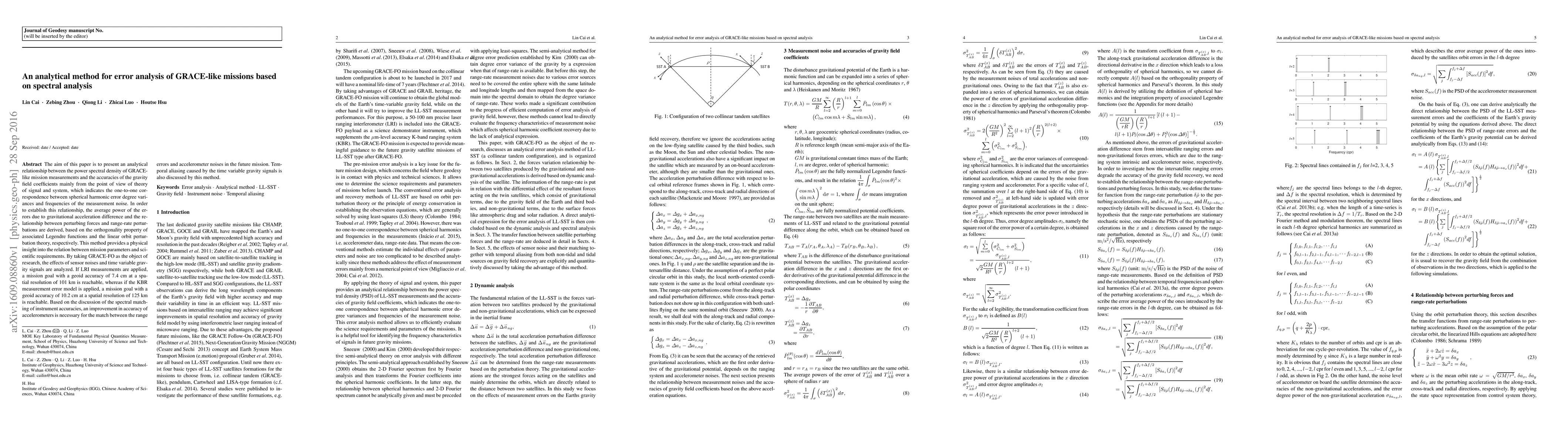 The aim of this paper is to present an analytical relationship between the power spectral density of GRACE-like mission measurements and the accuracies of the gravity field coefficients mainly from the point of view of theory of signal and system, which indicates the one-to-one correspondence between spherical harmonic error degree variances and frequencies of the measurement noise. In order to establish this relationship, the average power of the errors due to gravitational acceleration difference and the relationship between perturbing forces and range-rate perturbations are derived, based on the orthogonality property of associated Legendre functions and the linear orbit perturbation theory, respectively. This method provides a physical insight into the relation between mission parameters and scientific requirements. By taking GRACE-FO as the object of research, the effects of sensor noises and time variable gravity signals are analyzed. If LRI measurements are applied, a mission goal with a geoid accuracy of 7.4 cm at a spatial resolution of 101 km is reachable, whereas if the KBR measurement error model is applied, a mission goal with a geoid accuracy of 10.2 cm at a spatial resolution of 125 km is reachable. Based on the discussion of the spectral matching of instrument accuracies, an improvement in accuracy of accelerometers is necessary for the match between the range errors and accelerometer noises in the future mission. Temporal aliasing caused by the time variable gravity signals is also discussed by this method.