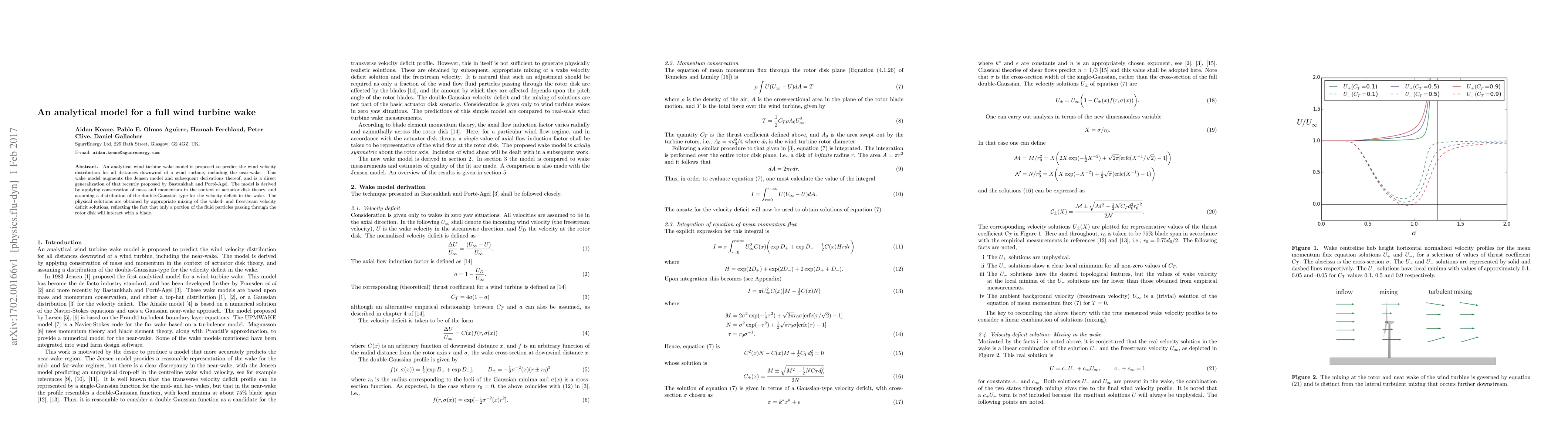 This paper proposes an analytical model to predict wind velocity distribution downwind of a wind turbine, extending the Jensen model and generalizing the Bastankhah and Porte-Agel approach. The model uses conservation of mass and momentum, actuator disk theory, and a double-Gaussian velocity deficit distribution to provide accurate predictions for both near-wake and far-wake regions.