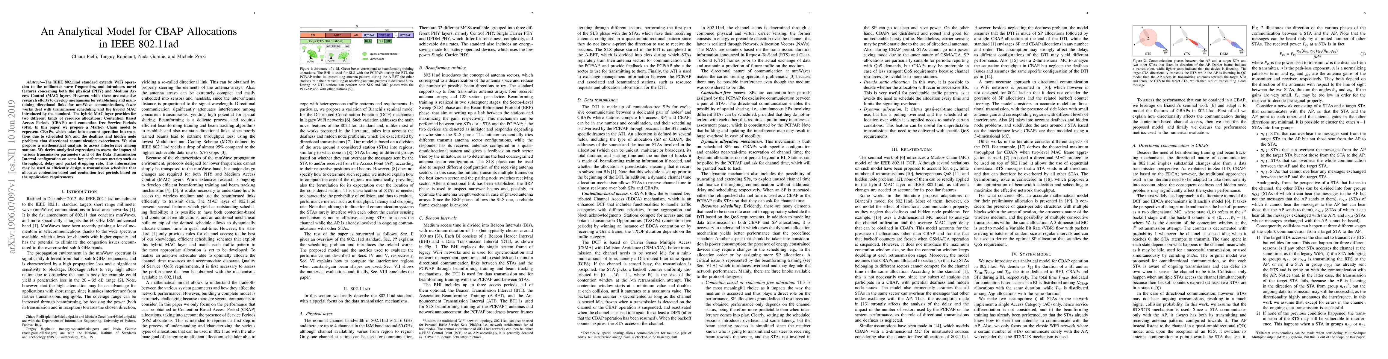 This paper proposes a Markov Chain model to analyze Contention Based Access Periods (CBAPs) in IEEE 802.11ad, addressing interruptions and interference issues. It derives analytical expressions to evaluate throughput, delay, and packet dropping rate, aiding in the design of efficient transmission schedulers.