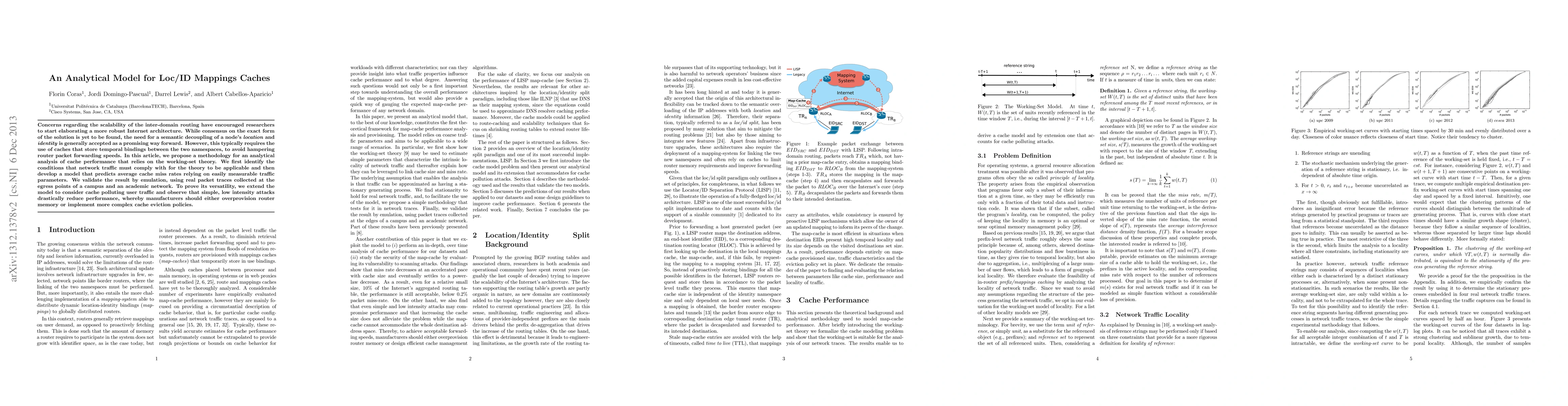 Concerns regarding the scalability of the inter-domain routing have encouraged researchers to start elaborating a more robust Internet architecture. While consensus on the exact form of the solution is yet to be found, the need for a semantic decoupling of a node's location and identity is generally accepted as a promising way forward. However, this typically requires the use of caches that store temporal bindings between the two namespaces, to avoid hampering router packet forwarding speeds. In this article, we propose a methodology for an analytical analysis of cache performance that relies on the working-set theory. We first identify the conditions that network traffic must comply with for the theory to be applicable and then develop a model that predicts average cache miss rates relying on easily measurable traffic parameters. We validate the result by emulation, using real packet traces collected at the egress points of a campus and an academic network. To prove its versatility, we extend the model to consider cache polluting user traffic and observe that simple, low intensity attacks drastically reduce performance, whereby manufacturers should either overprovision router memory or implement more complex cache eviction policies.