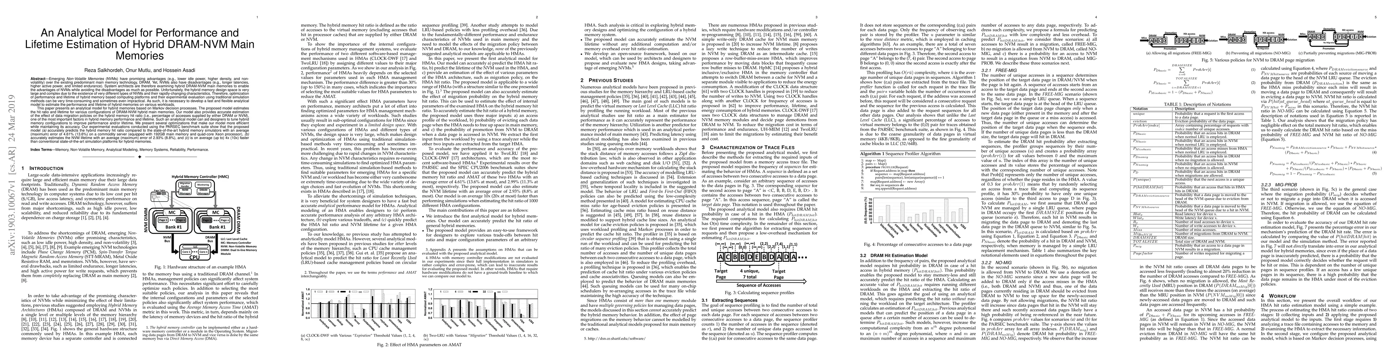 This paper presents an analytical model based on Markov decision processes to estimate the performance and lifetime of hybrid DRAM-NVM main memories. The model accurately predicts hit ratio and NVM lifetime with an average error of 4.61% and 2.93%, respectively, and is on average 4x faster than traditional simulation methods.