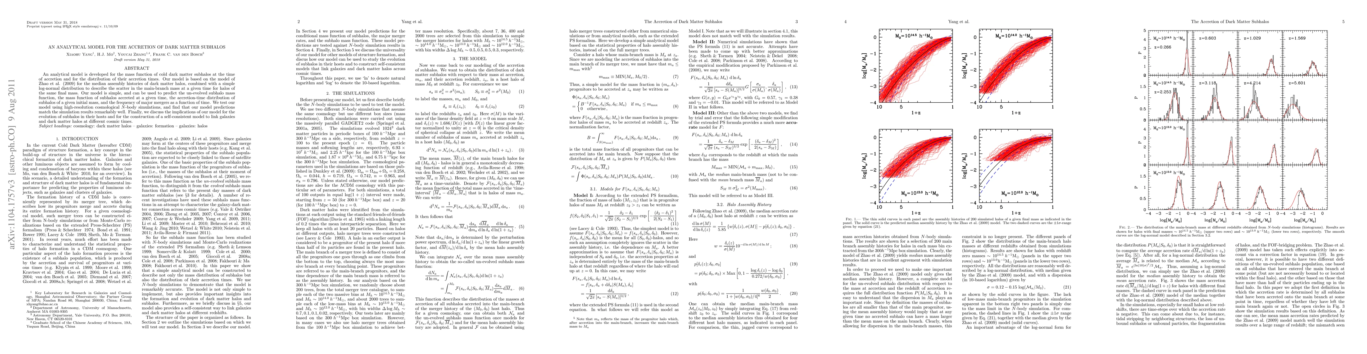This paper develops an analytical model to predict the mass function and accretion times of dark matter subhalos, based on Zhao et al.'s model for dark matter halo assembly histories and validated against high-resolution simulations, showing good agreement.