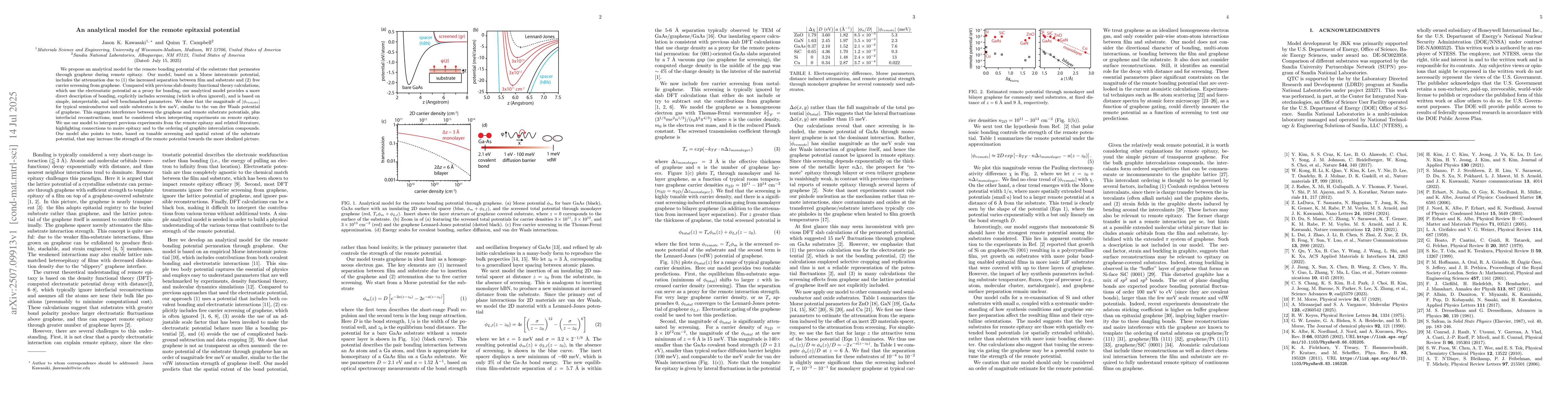 We propose an analytical model for the remote bonding potential of the substrate that permeates through graphene during remote epitaxy. Our model, based on a Morse interatomic potential, includes the attenuation due to (1) the increased separation between film and substrate and (2) free carrier screening from graphene. Compared with previous slab density functional theory calculations, which use the electrostatic potential as a proxy for bonding, our analytical model provides a more direct description of bonding, explicitly includes screening (which is often ignored), and is based on simple, interpretable, and well benchmarked parameters. We show that the magnitude of $|\phi_{remote}|$ for typical semiconductor and oxide substrates is few meV, similar to the van der Waals potential of graphene. This suggests interference between the graphene and remote substrate potentials, plus interfacial reconstructions, must be considered when interpreting experiments on remote epitaxy. We use our model to interpret previous experiments from the remote epitaxy and related literature, highlighting connections to moire epitaxy and to the ordering of graphite intercalation compounds. Our model also points to tests, based on tunable screening and spatial extent of the substrate potential, that may increase the strength of the remote potential towards the more idealized picture.