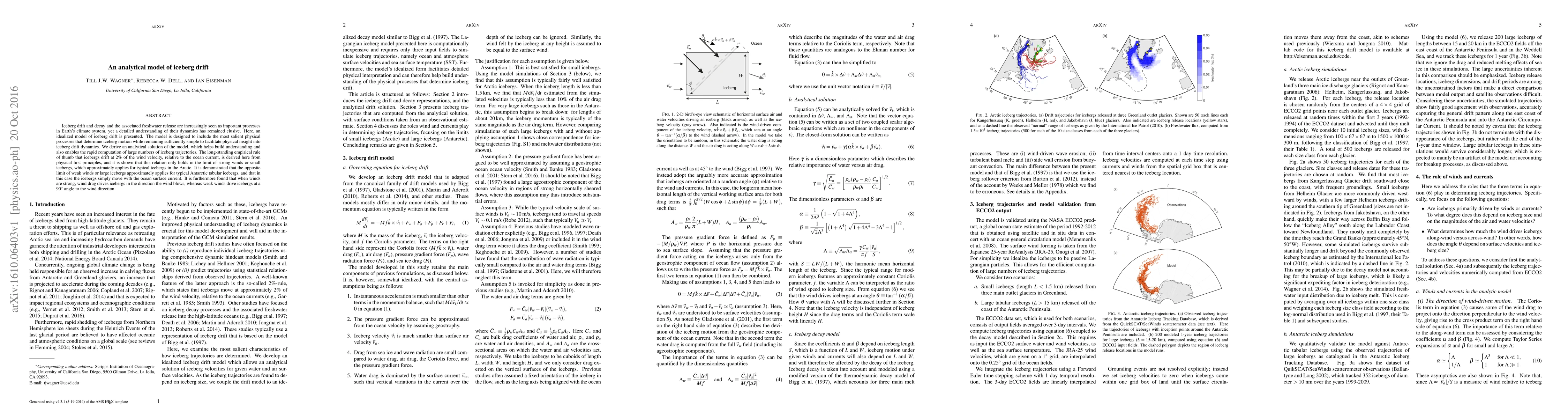 Iceberg drift and decay and the associated freshwater release are increasingly seen as important processes in Earth's climate system, yet a detailed understanding of their dynamics has remained elusive. Here, an idealized model of iceberg drift is presented. The model is designed to include the most salient physical processes that determine iceberg motion while remaining sufficiently simple to facilitate physical insight into iceberg drift dynamics. We derive an analytical solution of the model, which helps build understanding and also enables the rapid computation of large numbers of iceberg trajectories. The long-standing empirical rule of thumb that icebergs drift at 2% of the wind velocity, relative to the ocean current, is derived here from physical first principles, and it is shown that this relation only holds in the limit of strong winds or small icebergs, which approximately applies for typical icebergs in the Arctic. It is demonstrated that the opposite limit of weak winds or large icebergs approximately applies for typical Antarctic tabular icebergs, and that in this case the icebergs simply move with the ocean surface current. It is furthermore found that when winds are strong, wind drag drives icebergs in the direction the wind blows, whereas weak winds drive icebergs at a 90 degree angle to the wind direction.