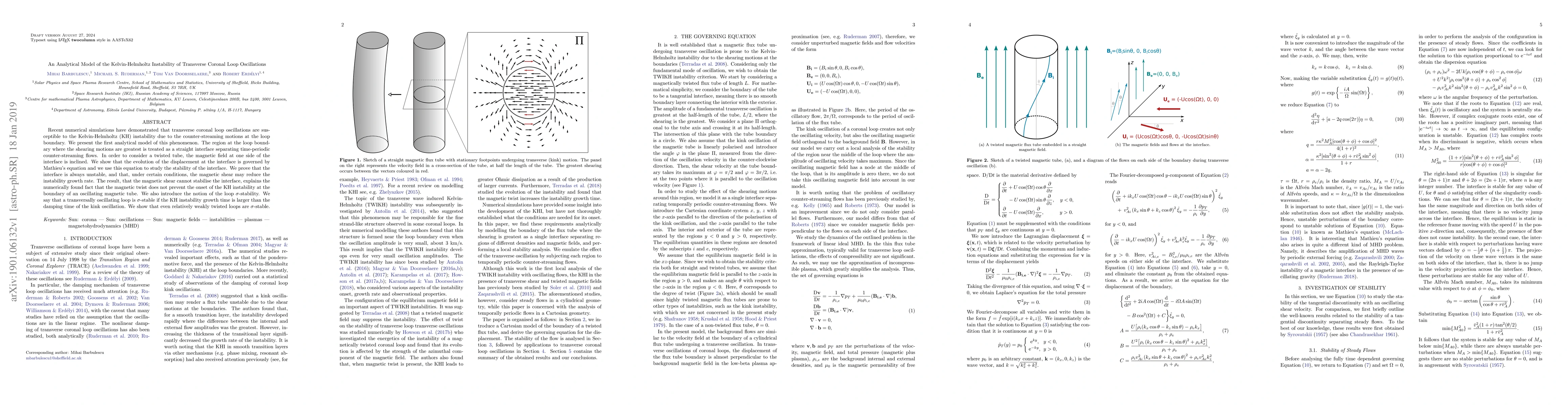 This paper presents an analytical model for the Kelvin-Helmholtz instability in transverse coronal loop oscillations, showing that the instability is always present at the loop boundary due to counter-streaming motions. It introduces the concept of loop $\sigma$-stability, demonstrating that even weakly twisted loops remain stable against the instability.