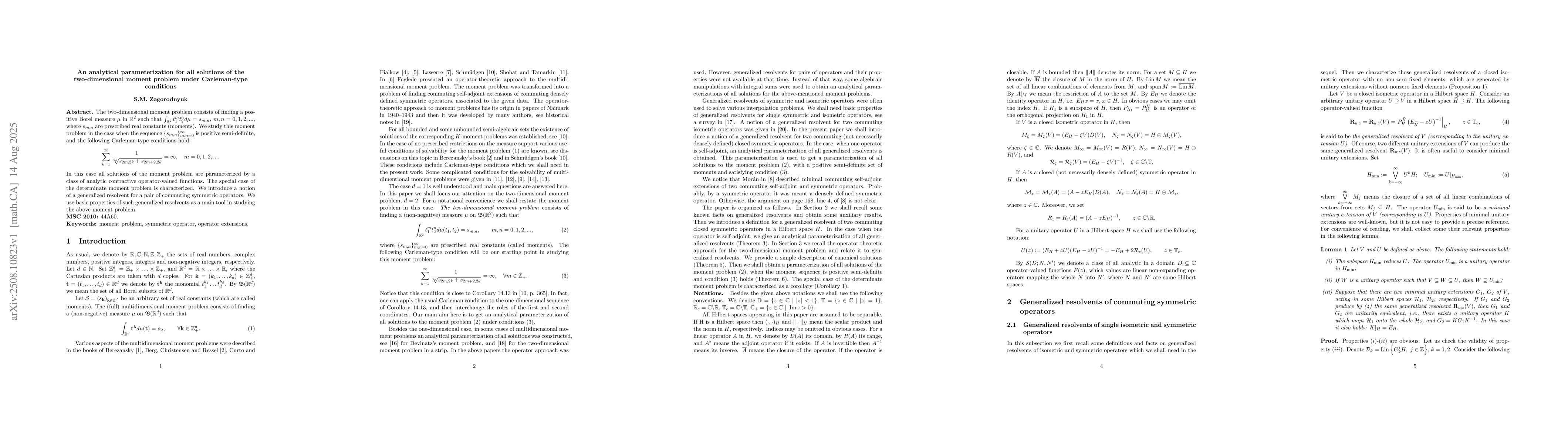 The two-dimensional moment problem consists of finding a positive Borel measure $\mu$ in $\mathbb{R}^2$ such that $\int_{\mathbb{R}^2} t_1^m t_2^n d\mu = s_{m,n}$, $m,n=0,1,2,...$, where $s_{m,n}$ are prescribed real constants (moments). We study this moment problem in the case when the sequence $\{ s_{m,n} \}_{m,n=0}^\infty$ is positive semi-definite, and the following Carleman-type conditions hold: $$ \sum_{k=1}^\infty \frac{1}{ \sqrt[2k]{ s_{2m,2k} + s_{2m+2,2k} } } = \infty,\quad m=0,1,2,.... $$ In this case all solutions of the moment problem are parameterized by a class of analytic contractive operator-valued functions. The special case of the determinate moment problem is characterized. We introduce a notion of a generalized resolvent for a pair of commuting symmetric operators. We use basic properties of such generalized resolvents as a main tool in studying the above moment problem.