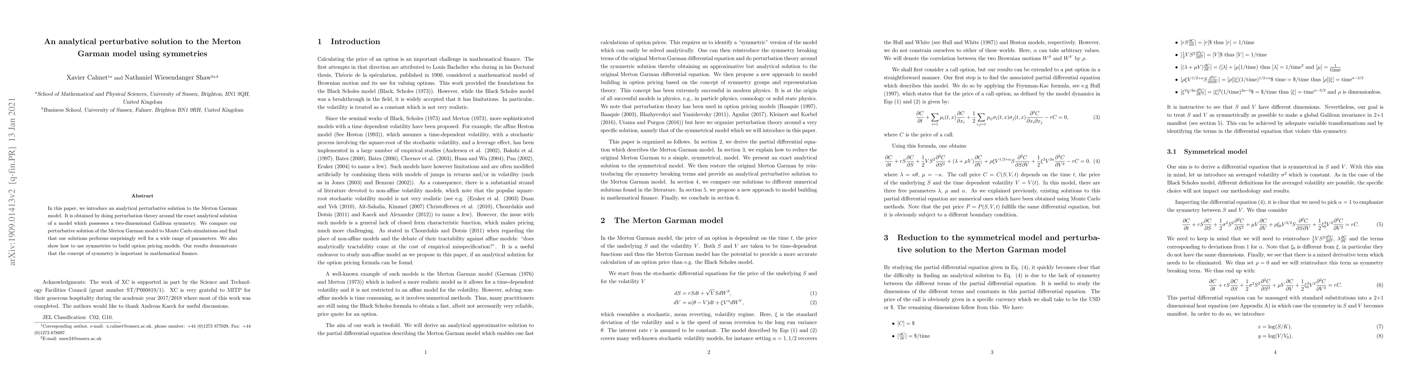 In this paper, we introduce an analytical perturbative solution to the Merton Garman model. It is obtained by doing perturbation theory around the exact analytical solution of a model which possesses a two-dimensional Galilean symmetry. We compare our perturbative solution of the Merton Garman model to Monte Carlo simulations and find that our solutions performs surprisingly well for a wide range of parameters. We also show how to use symmetries to build option pricing models. Our results demonstrate that the concept of symmetry is important in mathematical finance.