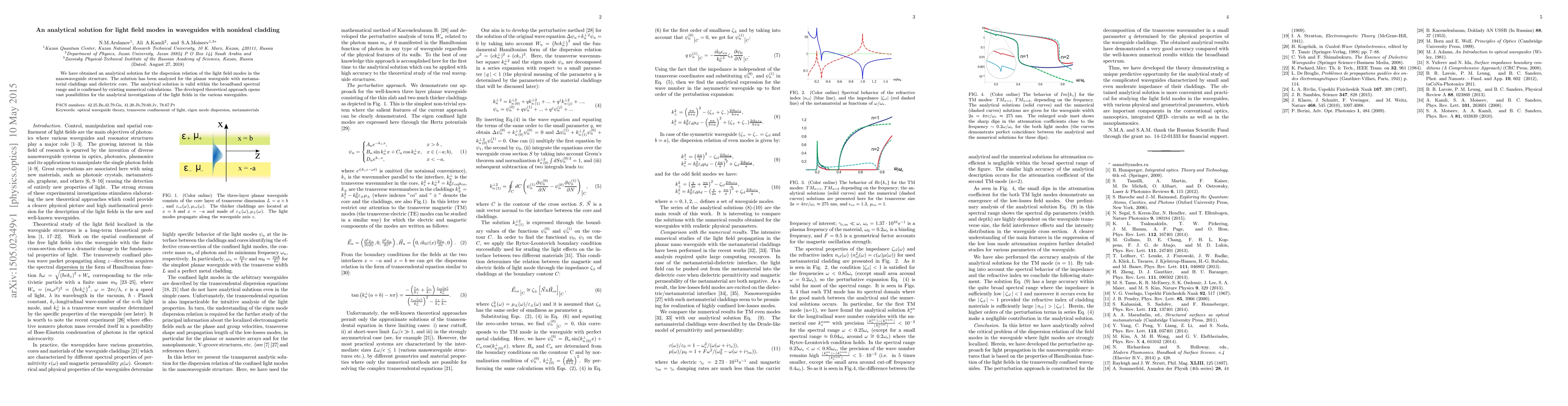 We have obtained an analytical solution for the dispersion relation of the light field modes in the nanowaveguide structure. The solution has been analyzed for the planar waveguide with metamaterial claddings and dielectric core. The analytical solution is valid within the broadband spectral range and is confirmed by existing numerical calculations. The developed theoretical approach opens vast possibilities for the analytical investigations of the light fields in the various waveguides.