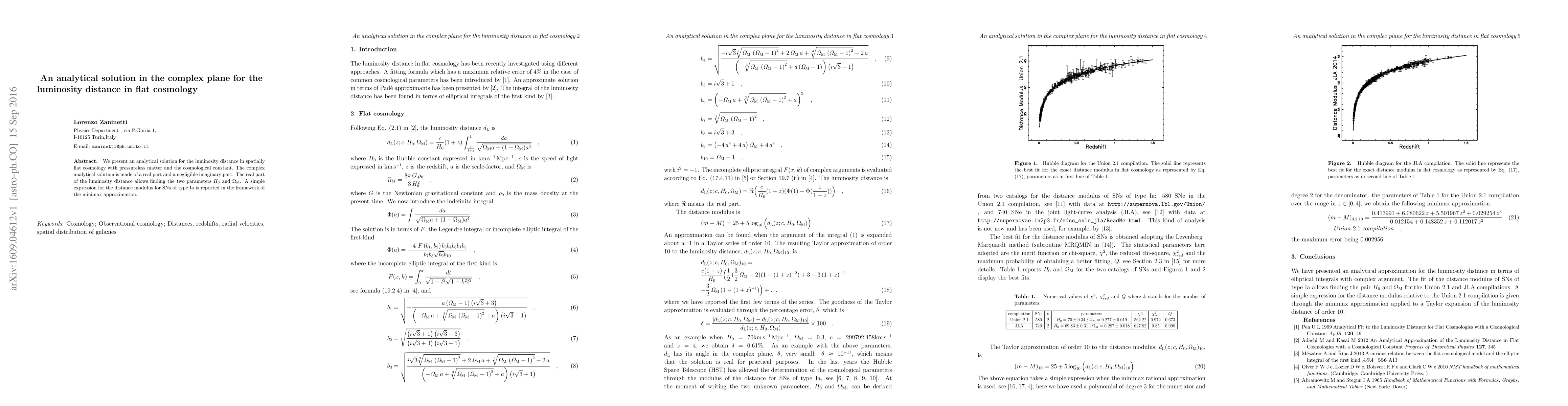 This paper provides an analytical solution for luminosity distance in flat cosmology, consisting of a real part and a negligible imaginary part, enabling the determination of $H_0$ and $\om$. It also reports a simple distance modulus expression for type Ia supernovae using the minimax approximation.