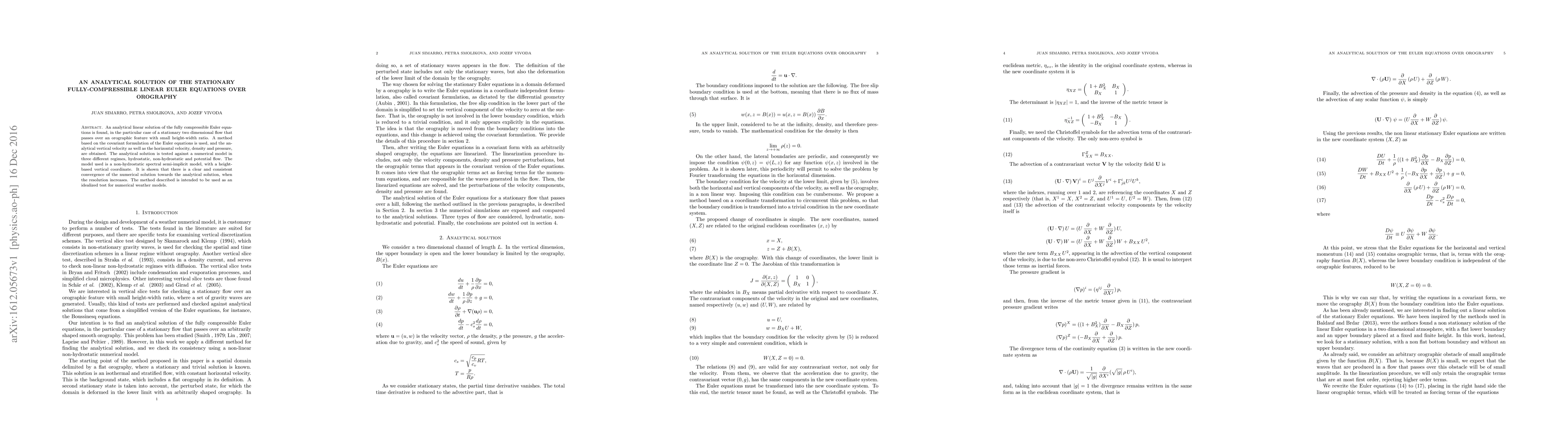 An analytical linear solution of the fully compressible Euler equations is found, in the particular case of a stationary two dimensional flow that passes over an orographic feature with small height-width ratio. A method based on the covariant formulation of the Euler equations is used, and the analytical vertical velocity as well as the horizontal velocity, density and pressure, are obtained. The analytical solution is tested against a numerical model in three different regimes, hydrostatic, non-hydrostatic and potential flow. The model used is a non-hydrostatic spectral semi-implicit model, with a height-based vertical coordinate. It is shown that there is a clear and consistent convergence of the numerical solution towards the analytical solution, when the resolution increases. The method described is intended to be used as an idealized test for numerical weather models.