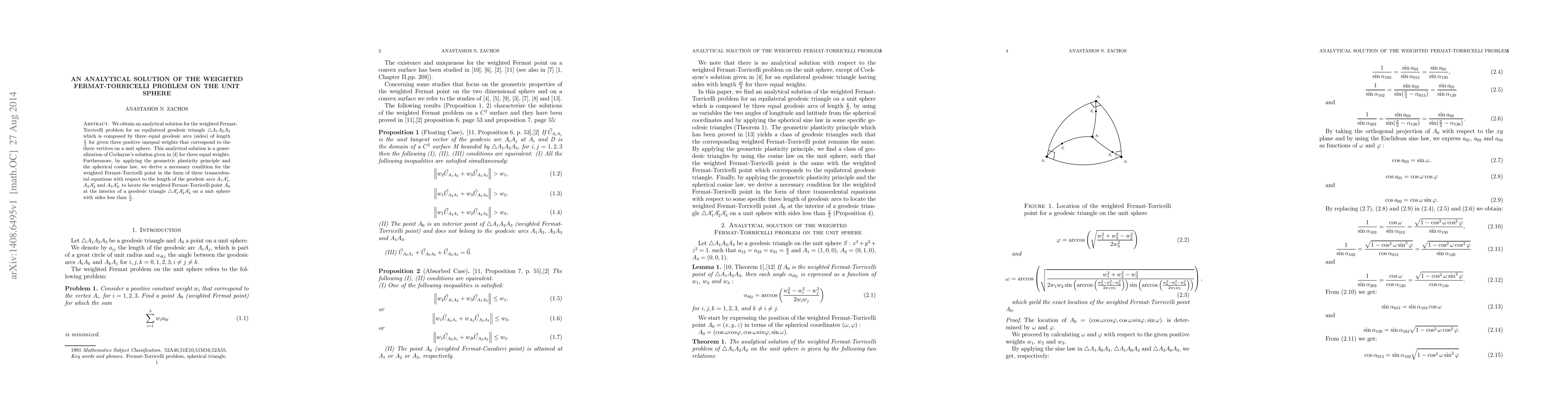This paper presents an analytical solution for the weighted Fermat-Torricelli problem on the unit sphere within an equilateral geodesic triangle, extending Cockayne's solution for equal weights. It derives transcendental equations for locating the weighted Fermat-Torricelli point under geometric plasticity principles.