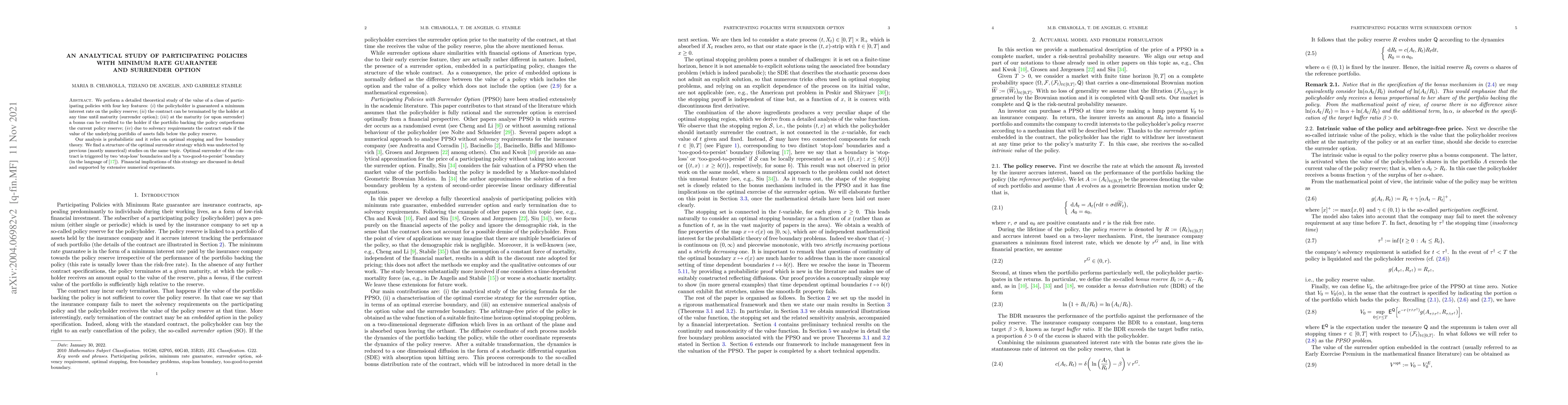 We perform a detailed theoretical study of the value of a class of participating policies with four key features: $(i)$ the policyholder is guaranteed a minimum interest rate on the policy reserve; $(ii)$ the contract can be terminated by the holder at any time until maturity (surrender option); $(iii)$ at the maturity (or upon surrender) a bonus can be credited to the holder if the portfolio backing the policy outperforms the current policy reserve; $(iv)$ due to solvency requirements the contract ends if the value of the underlying portfolio of assets falls below the policy reserve. Our analysis is probabilistic and it relies on optimal stopping and free boundary theory. We find a structure of the optimal surrender strategy which was undetected by previous (mostly numerical) studies on the same topic. Optimal surrender of the contract is triggered by two `stop-loss' boundaries and by a `too-good-to-persist' boundary (in the language of \cite{EV20}). Financial implications of this strategy are discussed in detail and supported by extensive numerical experiments.