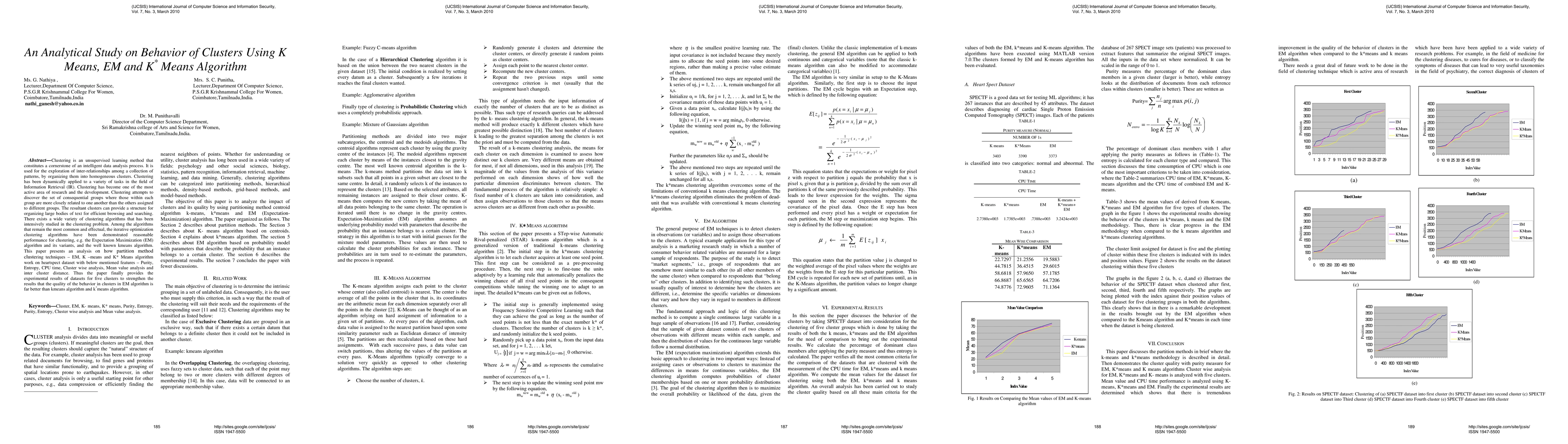This paper analyzes the performance of EM, K-means, and K* Means clustering algorithms on the heartspect dataset, evaluating them based on purity, entropy, CPU time, and cluster analysis. The results show that the EM algorithm outperforms K-means and K* Means in cluster quality.