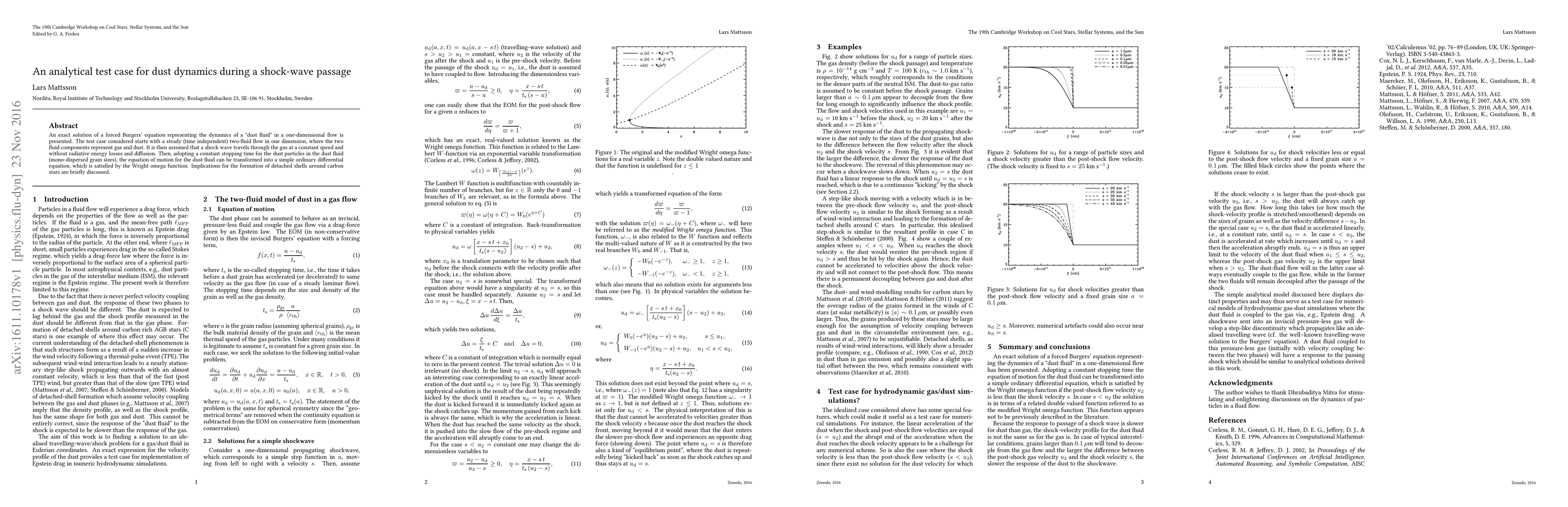 An exact solution of a forced Burgers' equation representing the dynamics of a "dust fluid" in a one-dimensional flow is presented. The test case considered starts with a steady (time independent) two-fluid flow in one dimension, where the two fluid components represent gas and dust. It is then assumed that a shock wave travels through the gas at a constant speed and without radiative energy losses and diffusion. Then, adopting a constant stopping time for the dust particles in the dust fluid (mono-dispersed grain sizes), the equation of motion for the dust fluid can be transformed into a simple ordinary differential equation, which is satisfied by the Wright omega function. Implications for the formation of detached shells around carbon stars are briefly discussed.