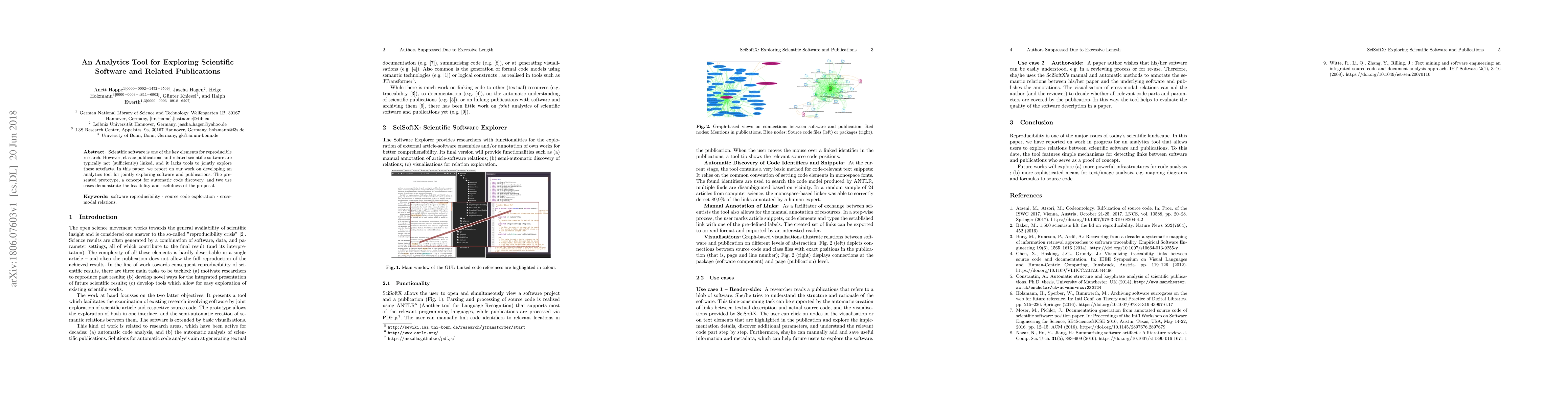 Scientific software is one of the key elements for reproducible research. However, classic publications and related scientific software are typically not (sufficiently) linked, and it lacks tools to jointly explore these artefacts. In this paper, we report on our work on developing an analytics tool for jointly exploring software and publications. The presented prototype, a concept for automatic code discovery, and two use cases demonstrate the feasibility and usefulness of the proposal. Submitted to TPDL 2018 as Demonstration Paper.