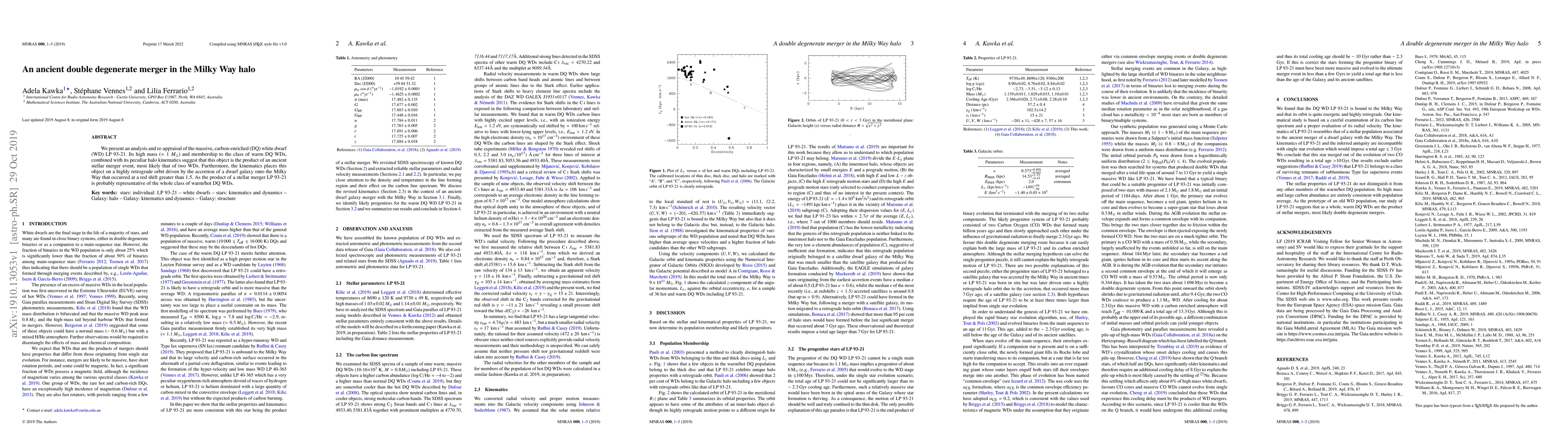 This paper analyzes the massive, carbon-enriched white dwarf LP 93-21, suggesting it resulted from an ancient double degenerate merger of two white dwarfs. Its unique kinematics indicate it was influenced by a dwarf galaxy accretion onto the Milky Way at a high redshift.