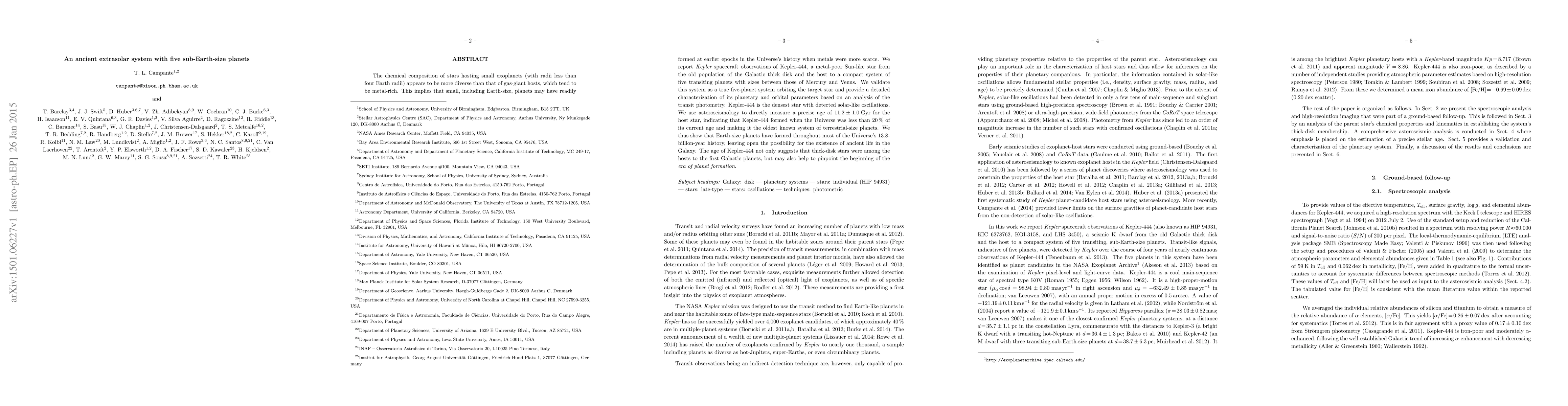 This research reports the discovery of a five-planet system around Kepler-444, an ancient, metal-poor star, with planets ranging in size from Mercury to Venus. The study reveals the system's age to be 11.2 billion years, indicating that Earth-sized planets have formed throughout most of the Universe's history, potentially suggesting the existence of ancient life in the Galaxy.