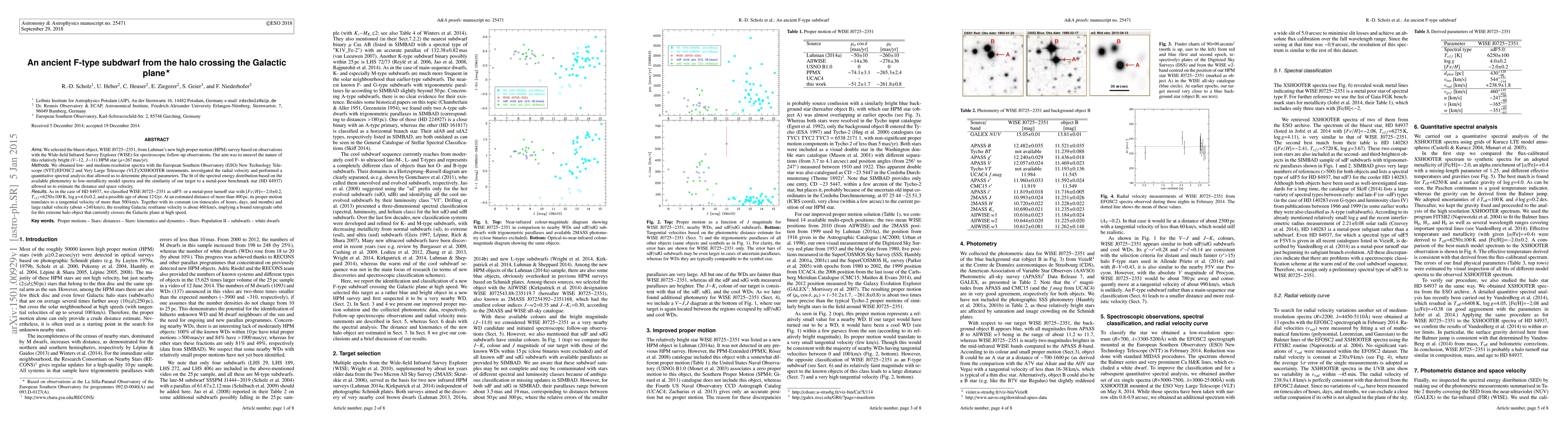 The study identifies WISE J0725-2351 as an ancient, metal-poor F-type subdwarf from the Galactic halo, with a high proper motion, large radial velocity, and bound retrograde orbit. Spectroscopic analysis classifies it as sdF5 with [Fe/H]=-2.0±0.2, Teff=6250±100K, log g=4.0±0.2, and a possible age of ~12 Gyr. Its estimated distance is over 400 pc, and it's currently crossing the Galactic plane at high speed.