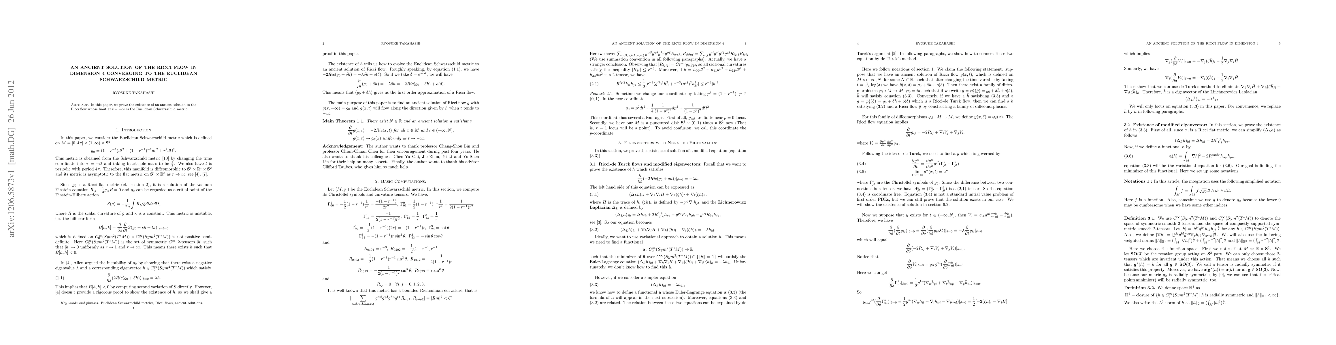 Summary: This paper demonstrates the existence of an ancient solution to the Ricci flow that converges to the Euclidean Schwarzschild metric as time approaches negative infinity. The result provides insight into the long-term behavior of the Ricci flow in dimension four.