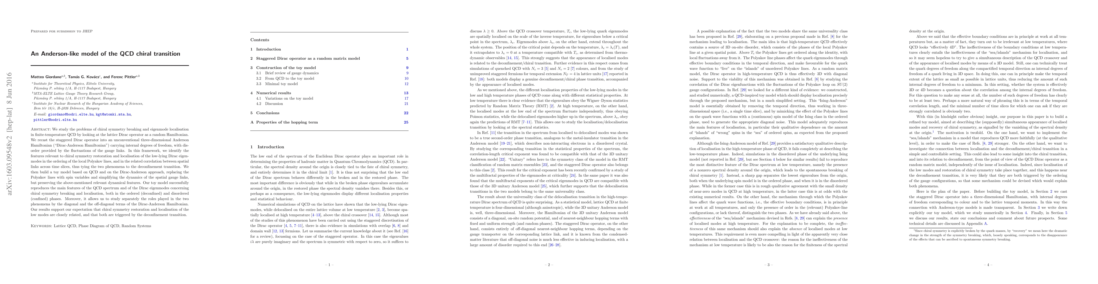 This research transforms the staggered Dirac operator in finite-temperature QCD into a three-dimensional Anderson Hamiltonian to study chiral symmetry breaking and eigenmode localisation. The study uses a simplified toy model that replicates QCD's main features, revealing a close relationship between chiral symmetry restoration and localisation of low-lying Dirac eigenmodes, both linked to the deconfinement transition.