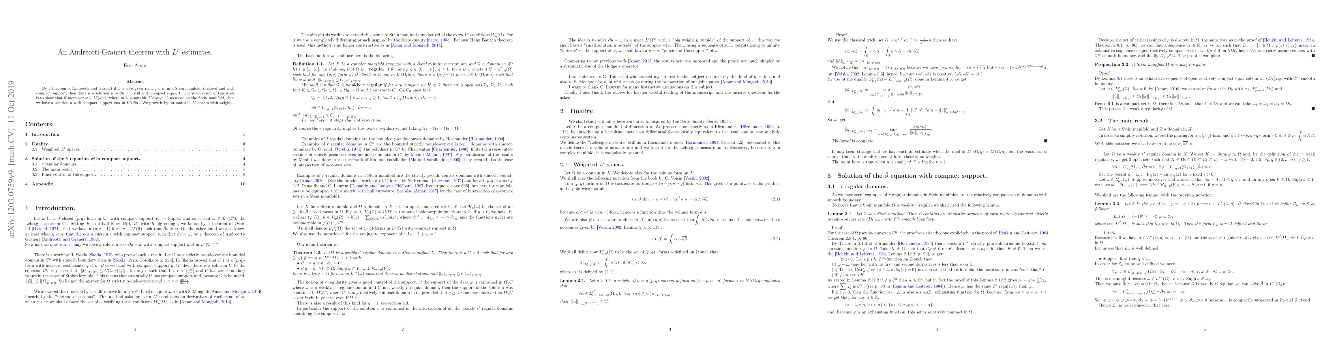 By a theorem of Andreotti and Grauert if $\omega $ is a $(p,q)$ current, $q < n,$ in a Stein manifold $\displaystyle \Omega ,\ \bar \partial $ closed and with compact support, then there is a solution $u$ to $\bar \partial u=\omega $ still with compact support in $\displaystyle \Omega .$ The main result of this work is to show that if moreover $\displaystyle \omega \in L^{r}(m),$ where $m$ is a suitable Lebesgue measure on the Stein manifold, then we have a solution $u$ with compact support {\sl and} in $L^{s}(m),\ \frac{1}{s}=\frac{1}{r}-\frac{1}{2(n+1)}.$ We prove it by estimates in $L^{r}$ spaces with weights.