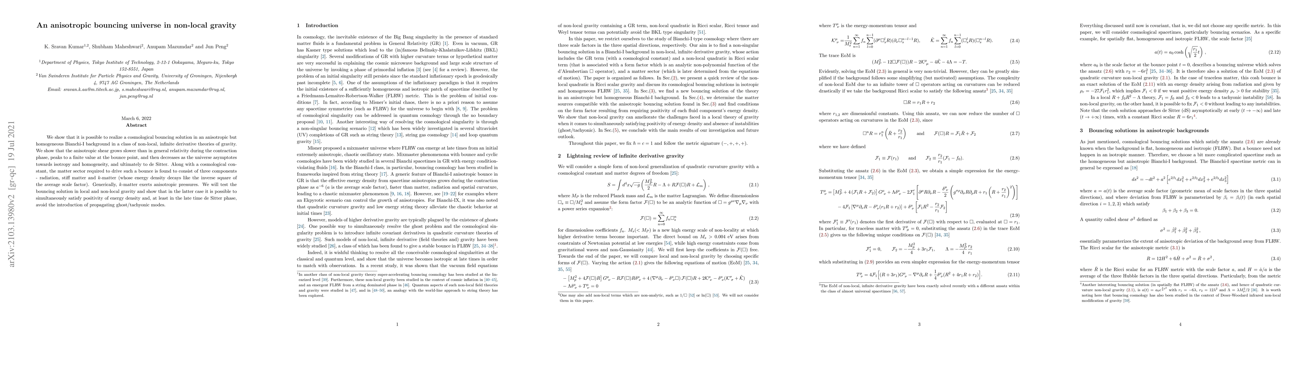 We show that it is possible to realize a cosmological bouncing solution in an anisotropic but homogeneous Bianchi-I background in a class of non-local, infinite derivative theories of gravity. We show that the anisotropic shear grows slower than in general relativity during the contraction phase, peaks to a finite value at the bounce point, and then decreases as the universe asymptotes towards isotropy and homogeneity, and ultimately to de Sitter. Along with a cosmological constant, the matter sector required to drive such a bounce is found to consist of three components - radiation, stiff matter and $k$-matter (whose energy density decays like the inverse square of the average scale factor). Generically, $k$-matter exerts anisotropic pressures. We will test the bouncing solution in local and non-local gravity and show that in the latter case it is possible to simultaneously satisfy positivity of energy density and, at least in the late time de Sitter phase, avoid the introduction of propagating ghost/tachyonic modes.