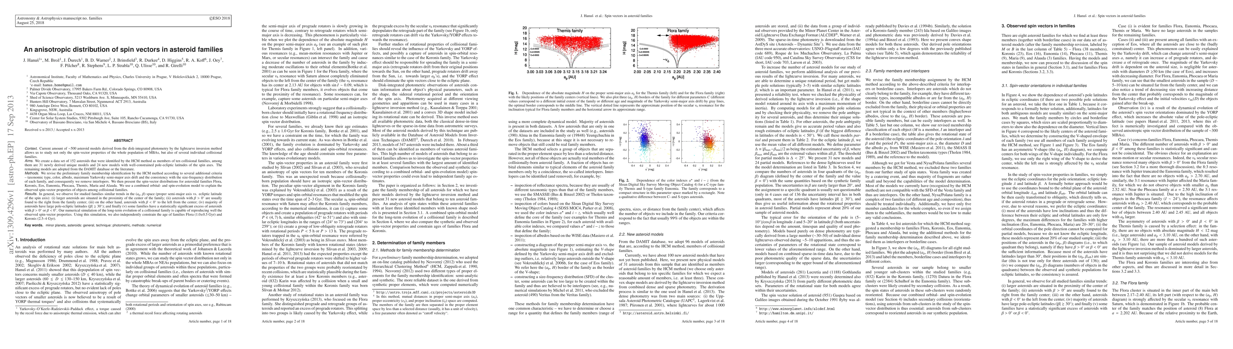 This paper investigates the spin-vector properties of asteroids within ten collisional families, revealing an anisotropic distribution. The study uses a dataset of 152 asteroids, including newly derived models, and applies a combined orbital- and spin-evolution model to explain the observed trends in spin-vector distributions, estimating the age of the Flora and Koronis families.