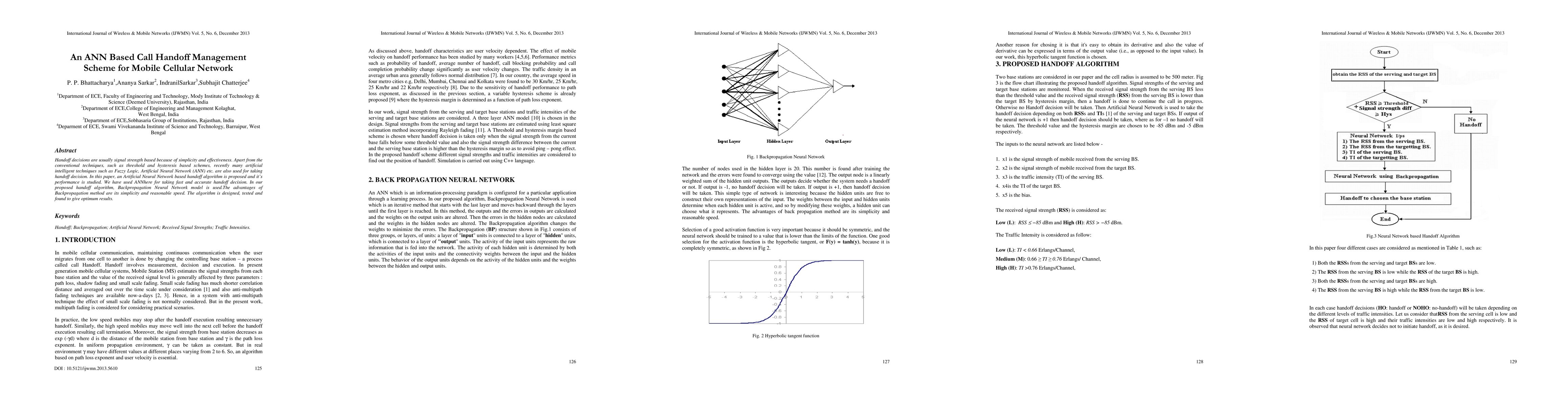 Handoff decisions are usually signal strength based because of simplicity and effectiveness. Apart from the conventional techniques, such as threshold and hysteresis based schemes, recently many artificial intelligent techniques such as Fuzzy Logic, Artificial Neural Network (ANN) etc. are also used for taking handoff decision. In this paper, an Artificial Neural Network based handoff algorithm is proposed and its performance is studied. We have used ANN here for taking fast and accurate handoff decision. In our proposed handoff algorithm, Backpropagation Neural Network model is used.The advantages of Back propagation method are its simplicity and reasonable speed. The algorithm is designed, tested and found to give optimum results.