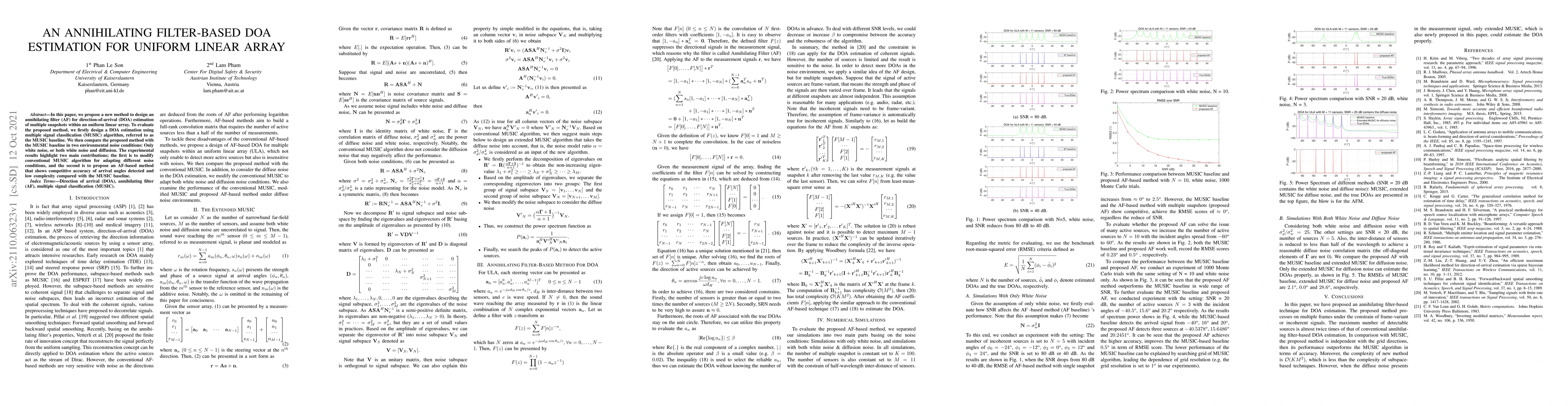 A new method is proposed for direction-of-arrival estimation using annihilating filters in uniform linear arrays, showing competitive accuracy with traditional MUSIC algorithm while reducing complexity.