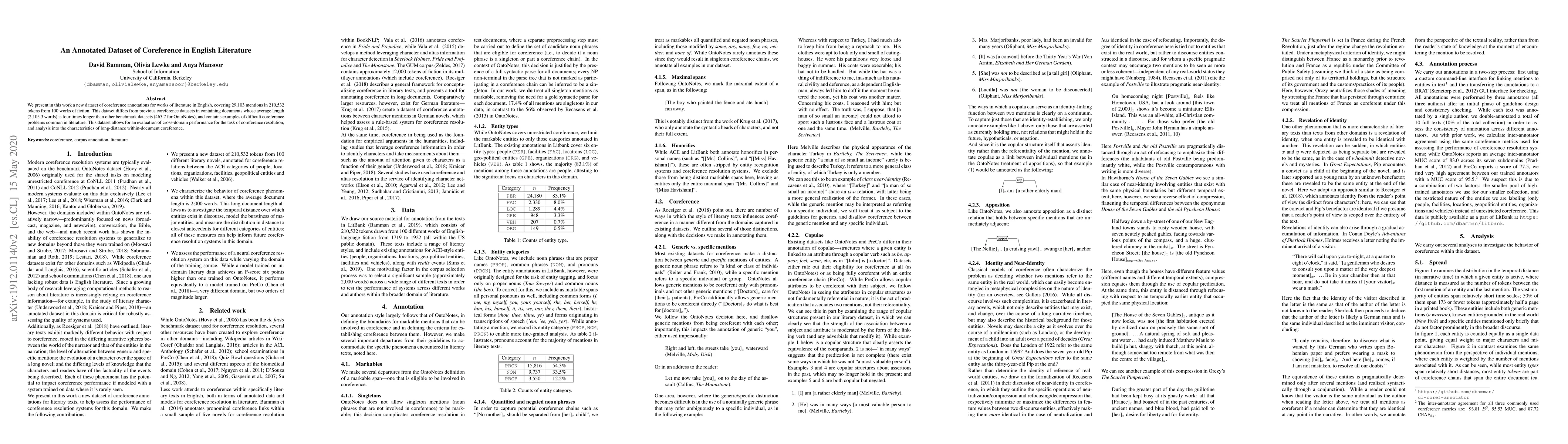 This paper introduces a new annotated dataset for coreference in English literature, featuring 29,103 mentions from 100 fiction works, which allows for cross-domain coreference resolution evaluation and analysis of long-distance coreference.