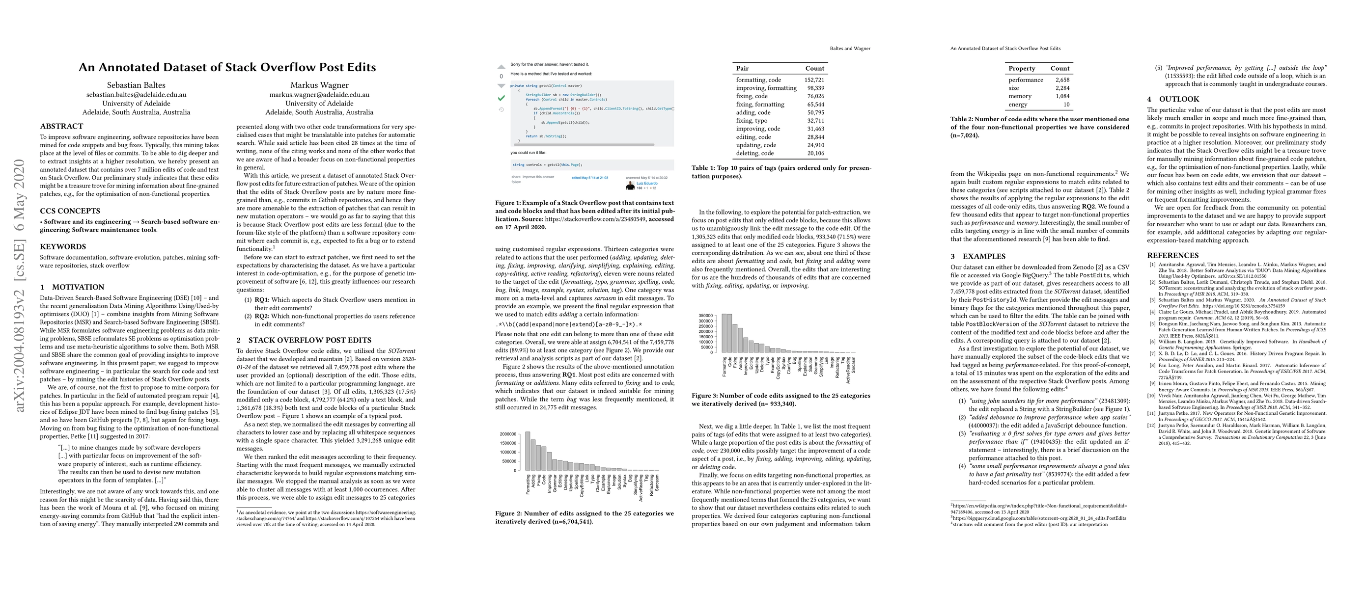 To improve software engineering, software repositories have been mined for code snippets and bug fixes. Typically, this mining takes place at the level of files or commits. To be able to dig deeper and to extract insights at a higher resolution, we hereby present an annotated dataset that contains over 7 million edits of code and text on Stack Overflow. Our preliminary study indicates that these edits might be a treasure trove for mining information about fine-grained patches, e.g., for the optimisation of non-functional properties.