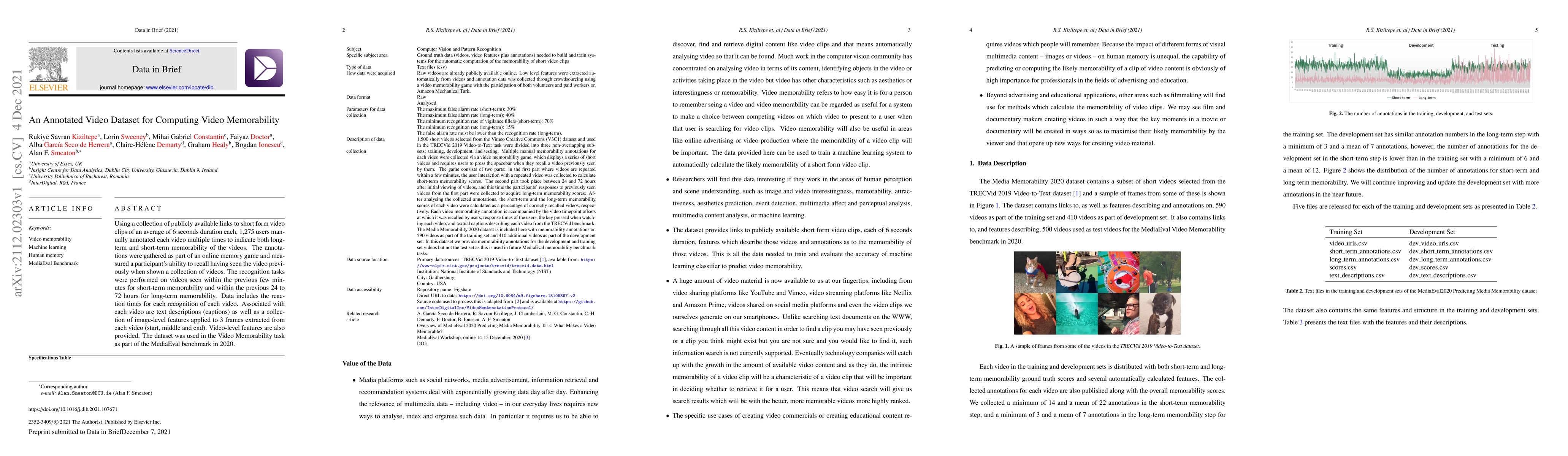 This paper presents a dataset of annotated short video clips where 1,275 users rated their memorability over short and long terms, providing valuable data for studying video recall. The dataset includes reaction times, video captions, and image-level features for three frames per video, alongside video-level features.