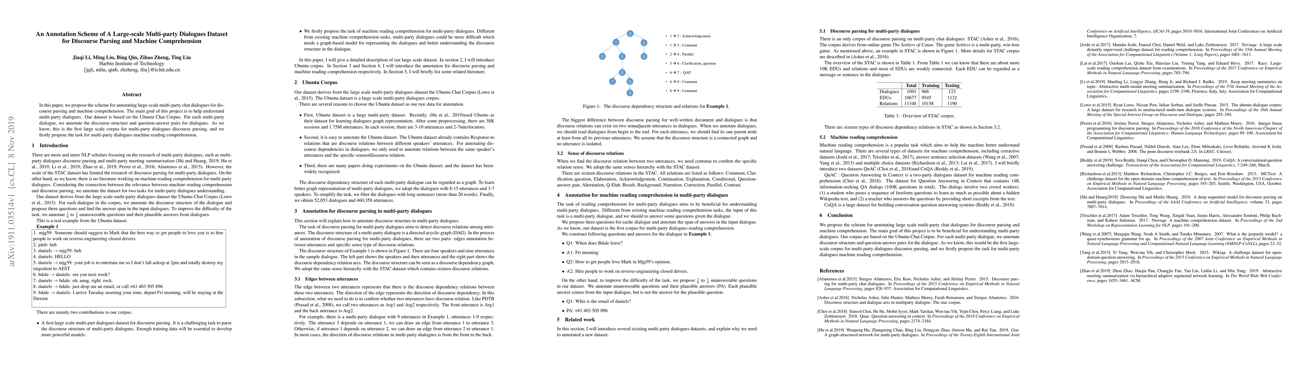 This paper introduces an annotation scheme for large-scale multi-party dialogues from the Ubuntu Chat Corpus, focusing on discourse parsing and machine comprehension. The annotated dataset includes discourse structures and question-answer pairs, marking the first large-scale corpus for multi-party dialogues for these tasks.