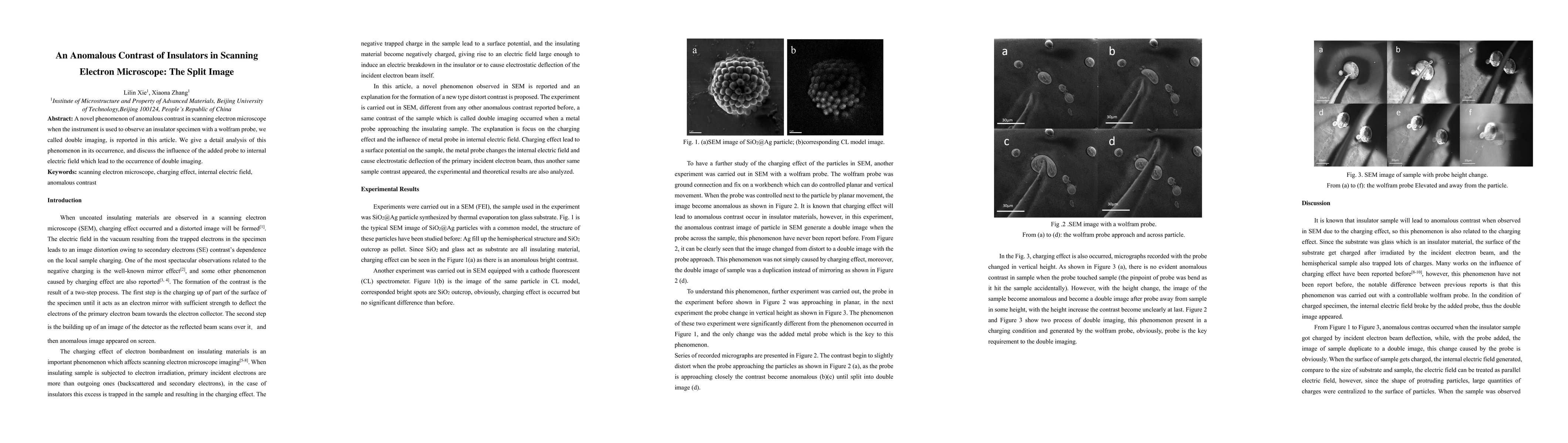 Researchers discovered a novel phenomenon in scanning electron microscopes where an insulator specimen appears as two images when observed with a wolfram probe, known as double imaging. This effect is attributed to the added probe's influence on the internal electric field of the specimen.